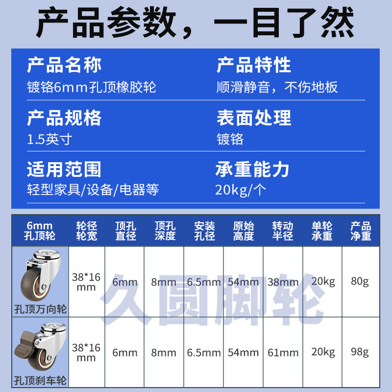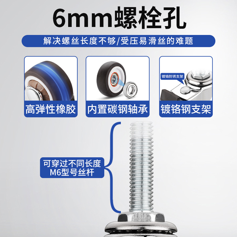 1.5 inch 6mm hole top universal wheel furniture roller rubber wheel caster silent wheel steering wheel extended M6 screw