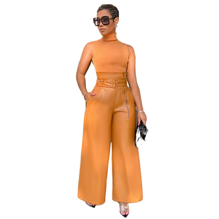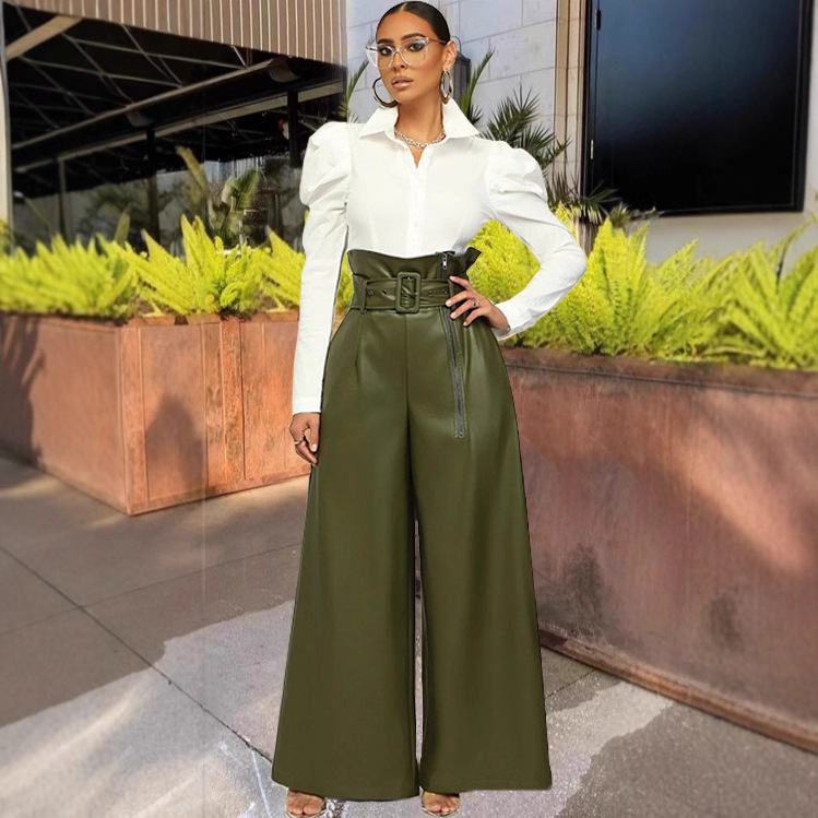 2021 Winter New Women's Clothing European and American Fashion High Waist PU Leather Pants INS Style Night Shop Metal Belt Wide Leg Pants