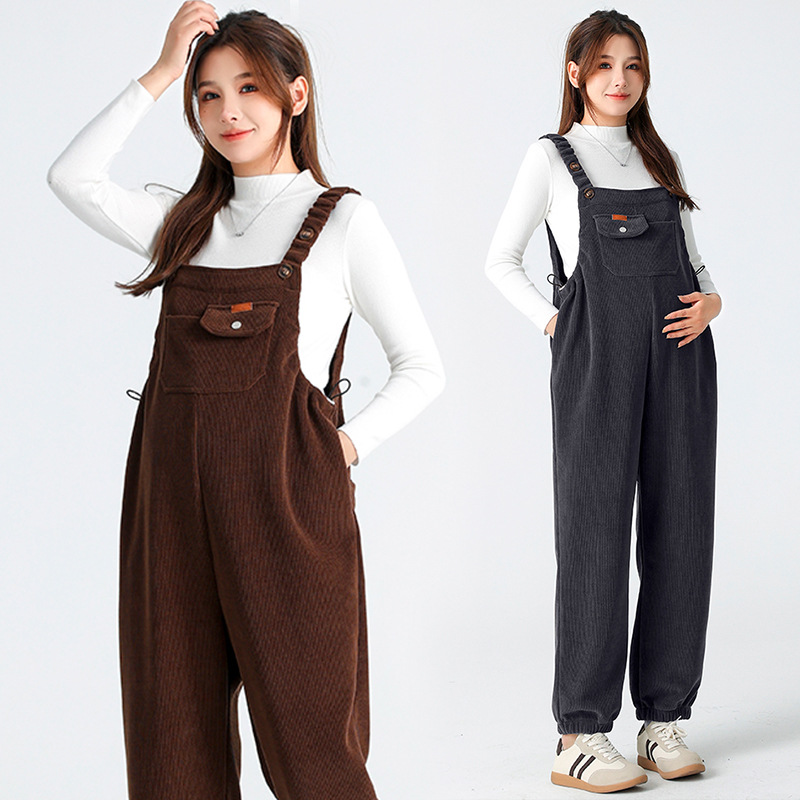 2024 New Maternity Overalls Spring and Autumn Set for Petite Women, Fleece-Lined and Thickened, Two-Piece Set for Autumn and Winter with Belly Support