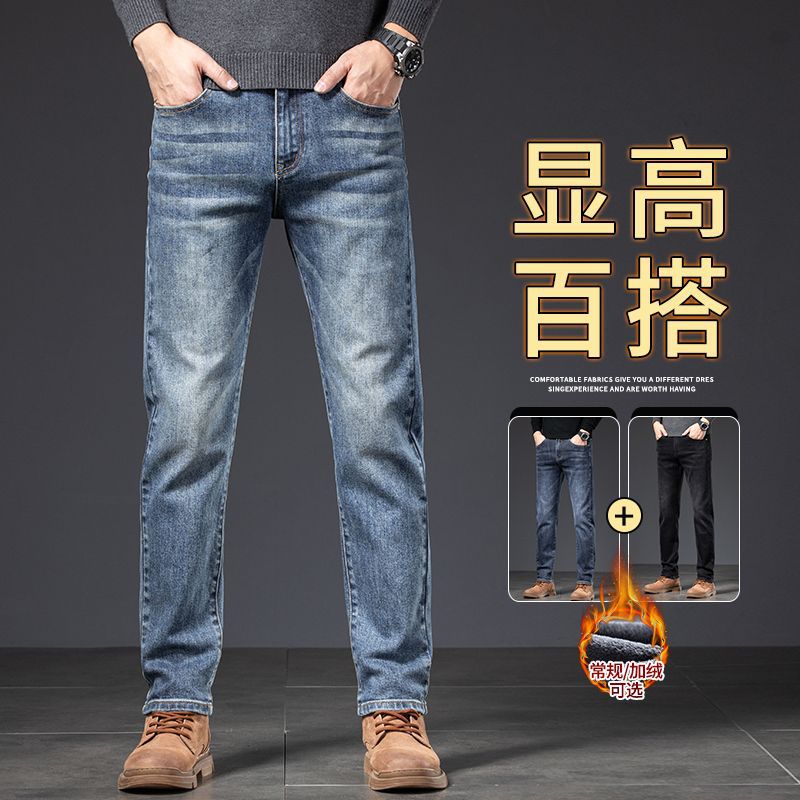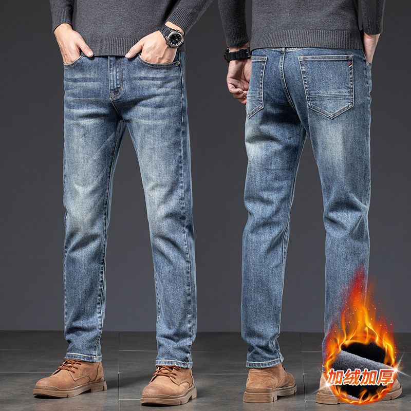 2025 Autumn/Winter New High-End European Men's Casual Loose Stretch Straight-Leg Light Luxury Business Fleece-Lined Jeans for Men