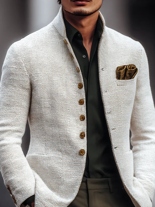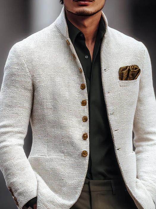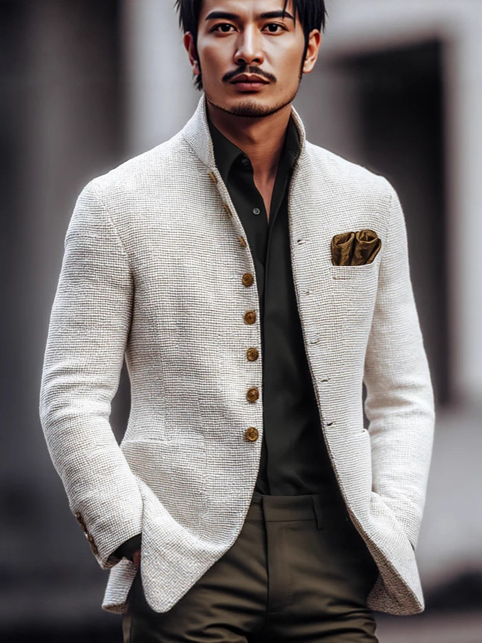 2025 European and American Men's Casual Stand Collar Jacket Men's Jacket Slim Button Flap Pocket Pants Long Sleeve Small Suit Jacket