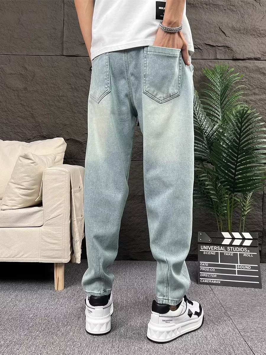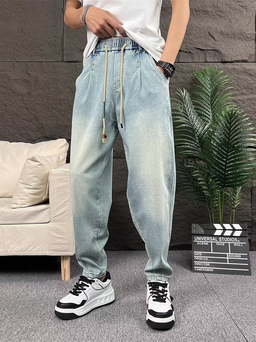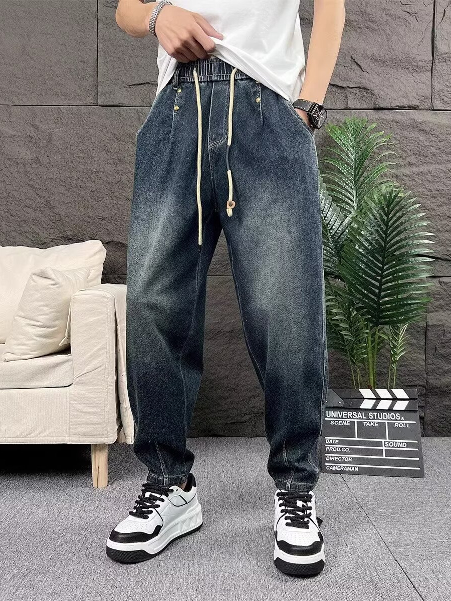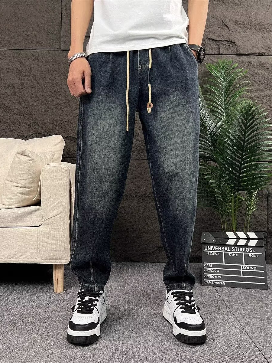 2025 Foreign Trade Men's American Style Loose Jeans Men's Summer Korean Style Dark Color Loose Drawstring Harem Pants