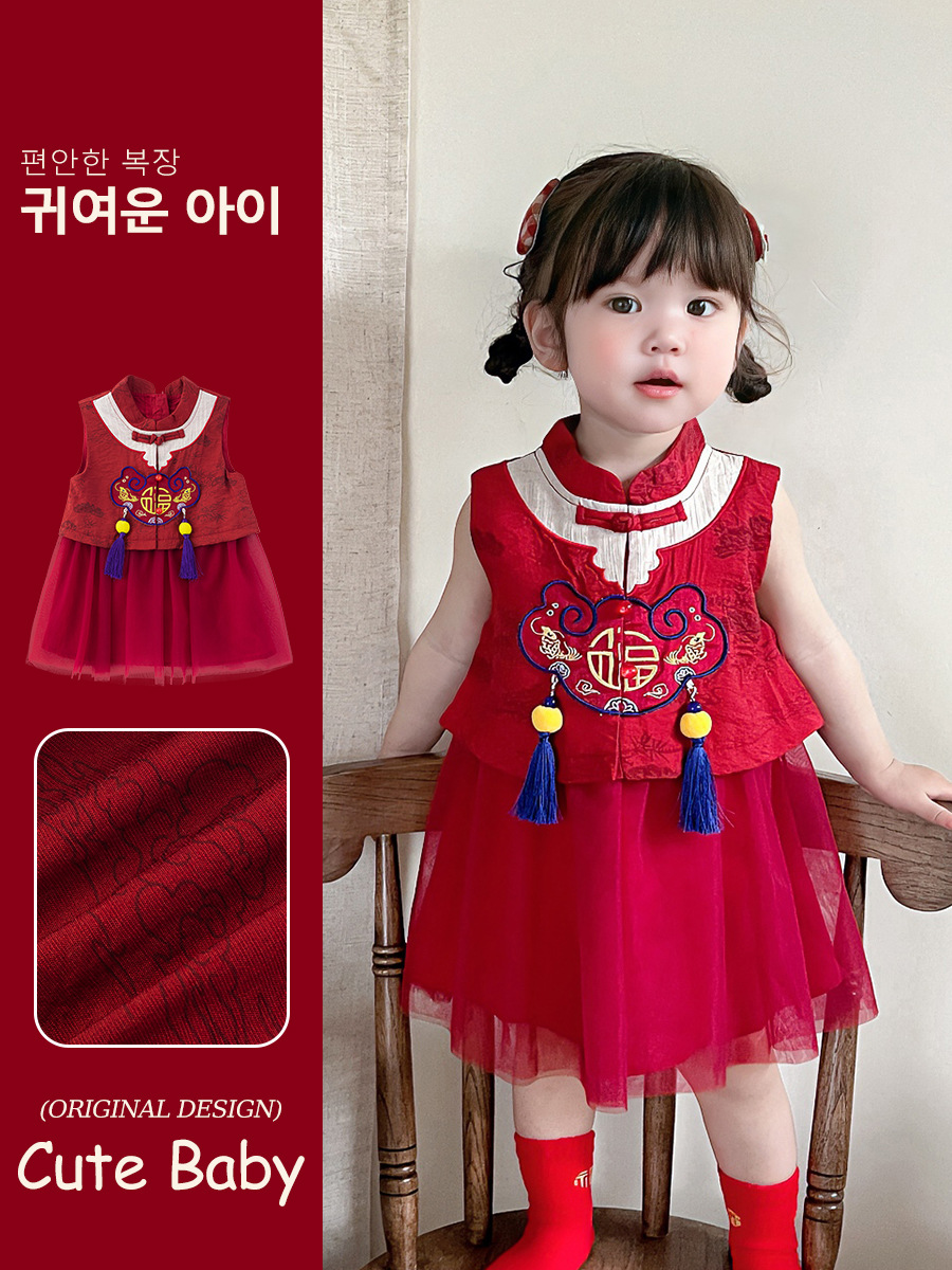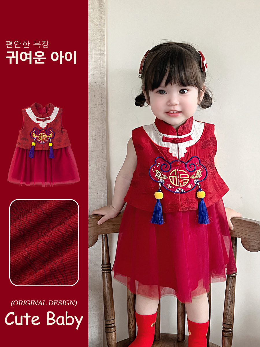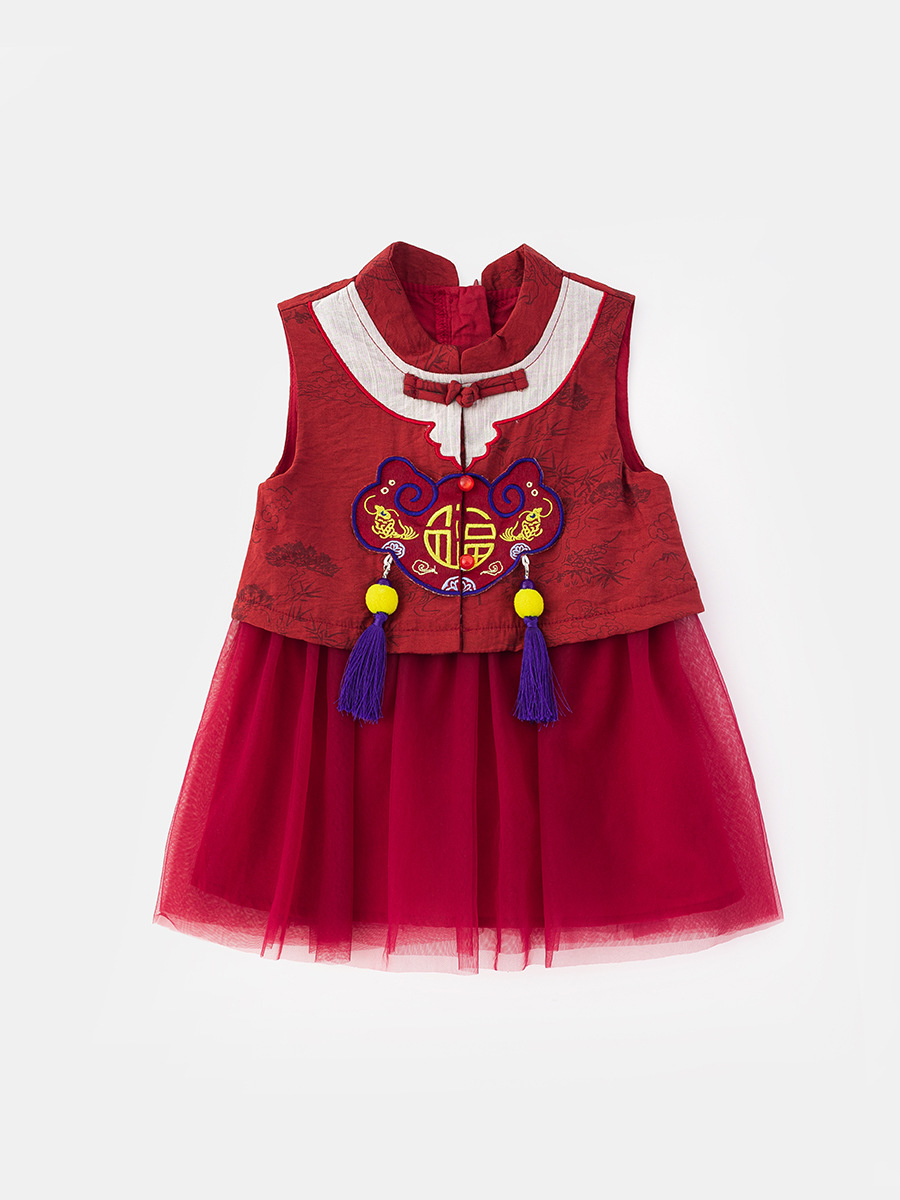 2025 Girls New Chinese Red dress Summer Thin Princess Dress Mesh National Style Dress for Baby Girls 5296