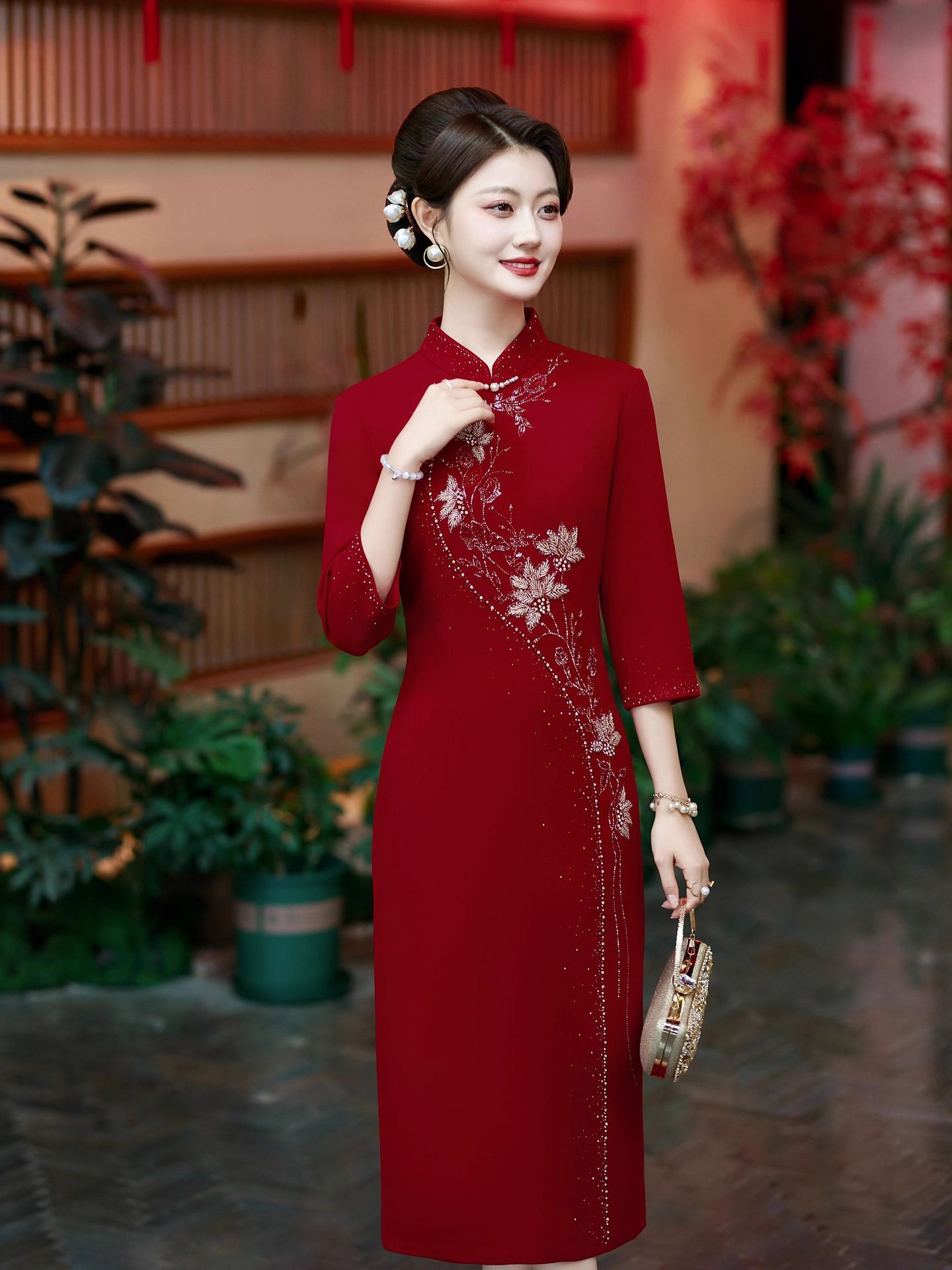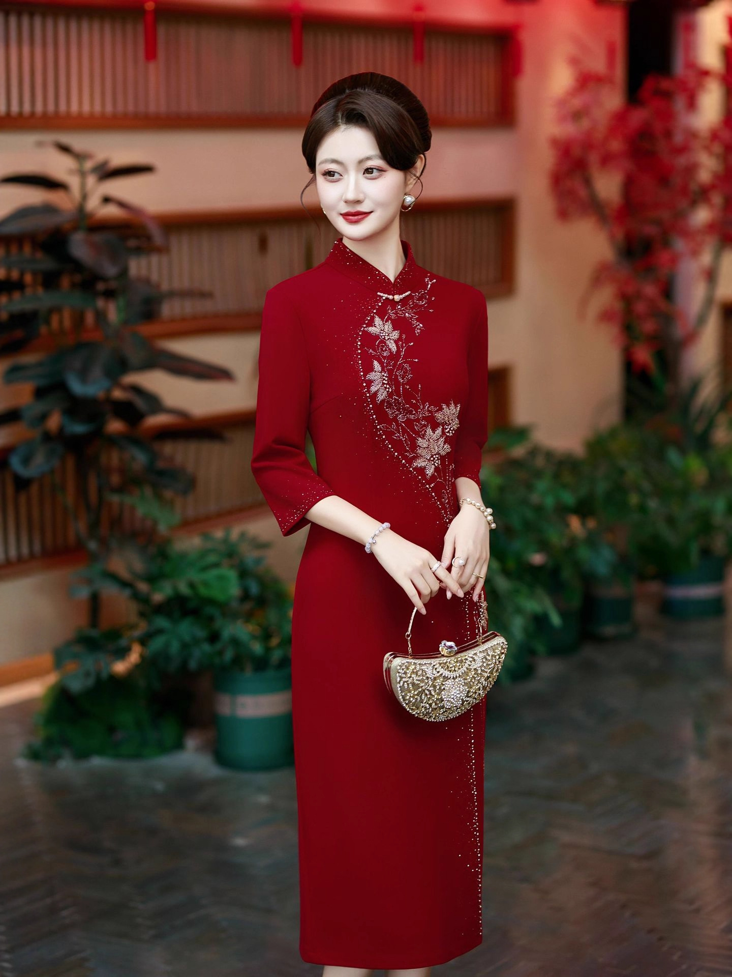 2025 New Autum Burgundy Women's Cheongsam Wedding Dress Cheongsam Wedding Banquet Cheongsam Mother's Dress