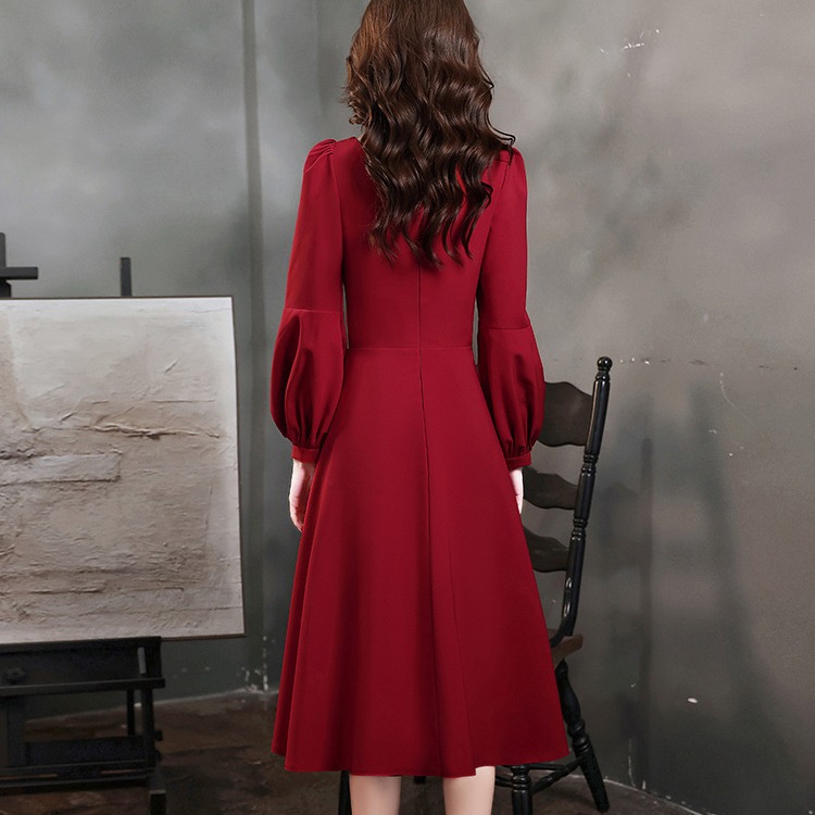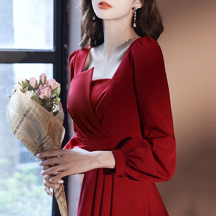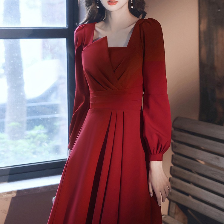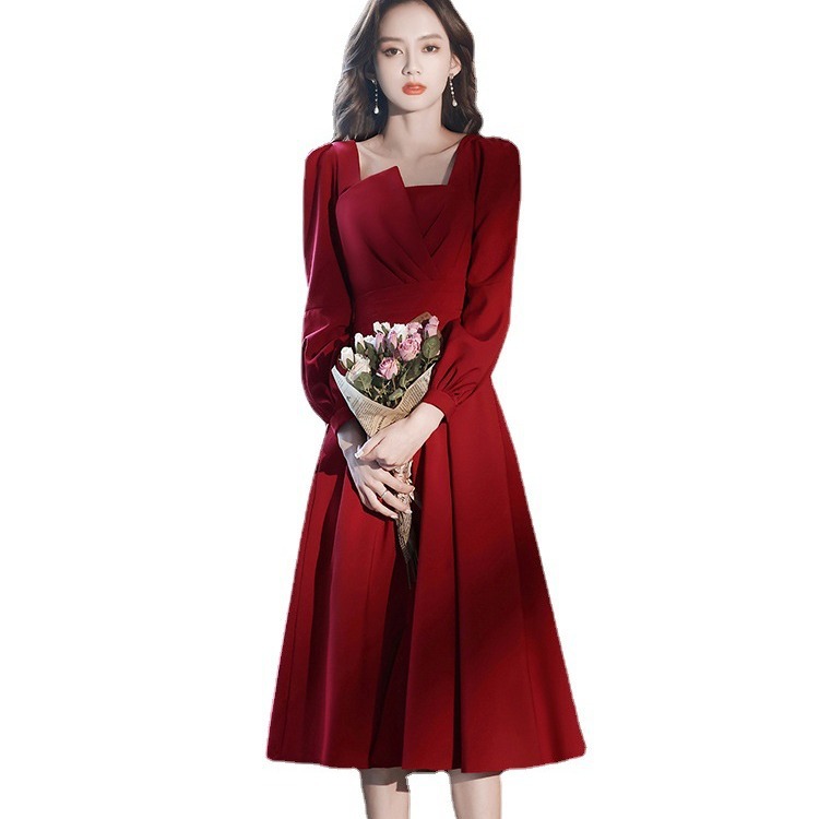 2025 New Autumn and Winter Wedding Dress for the Bride, Red Simple Long-Sleeved Engagement and Homecoming Dress