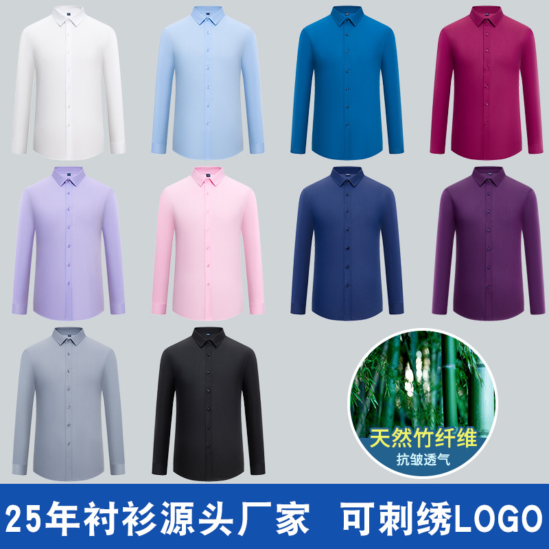 2025 New Bamboo Fiber Shirt Men's Long Sleeve Shirt Solid Color Elastic No-Iron Professional Wear Work Wear Embroidered Logo