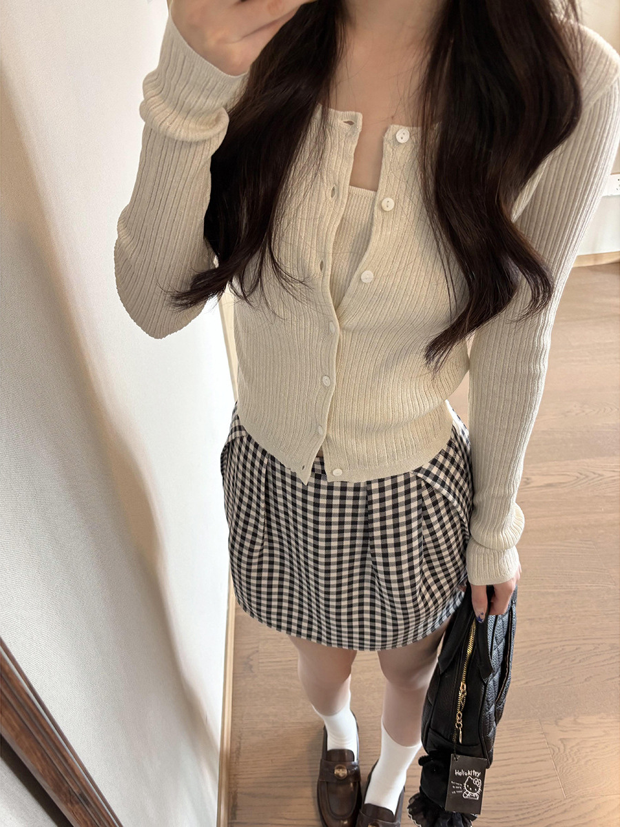 2025 new early spring with a set of Korean style gentle style knitted cardigan suspender plaid skirt suit