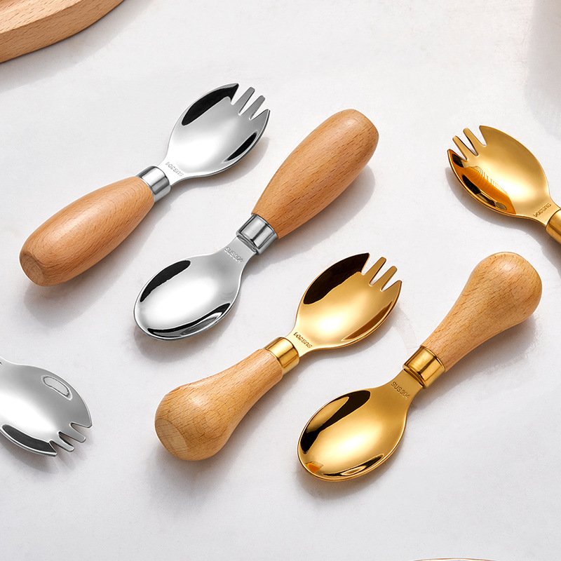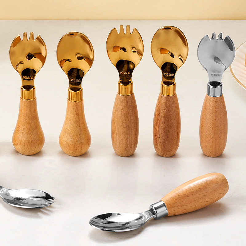 304 Stainless Steel Kidsren's Tableware Household Spoon and Fork Baby Feeding Spoon and Fork Mini Wooden Handle Food Supplement Tableware