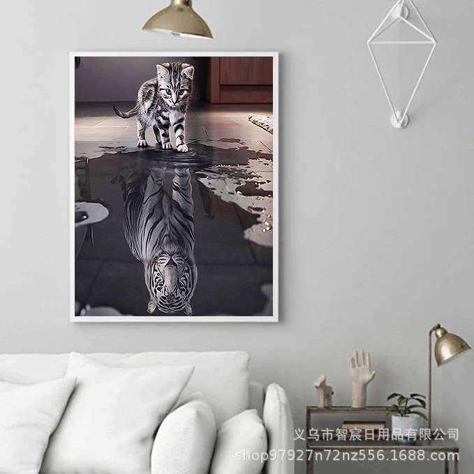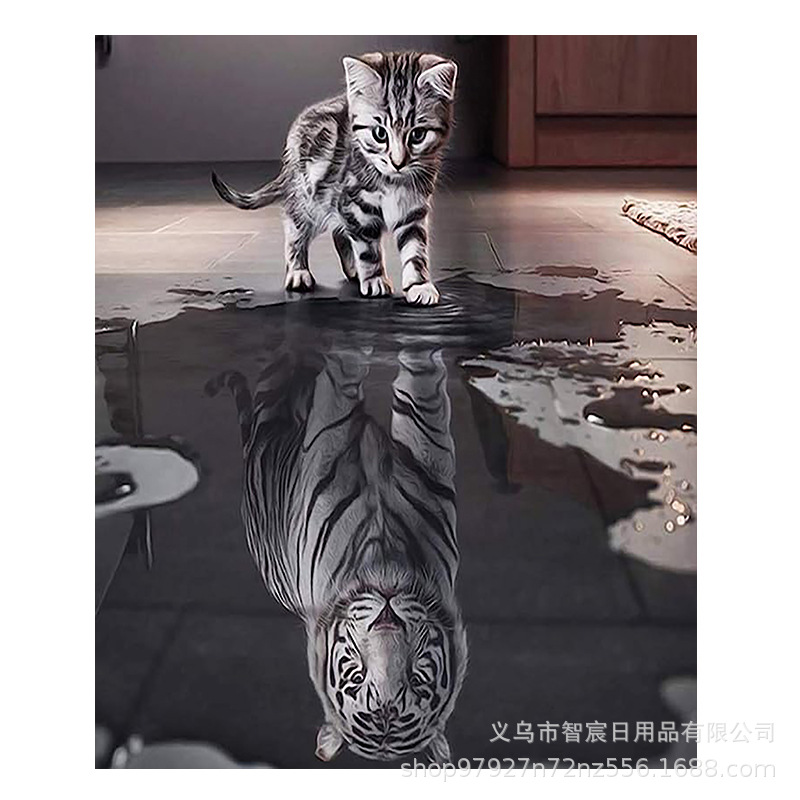 5D diamond painting cross-border wholesale cat white tiger reflection handmade art stickers DIY round diamond full diamond factory direct sales