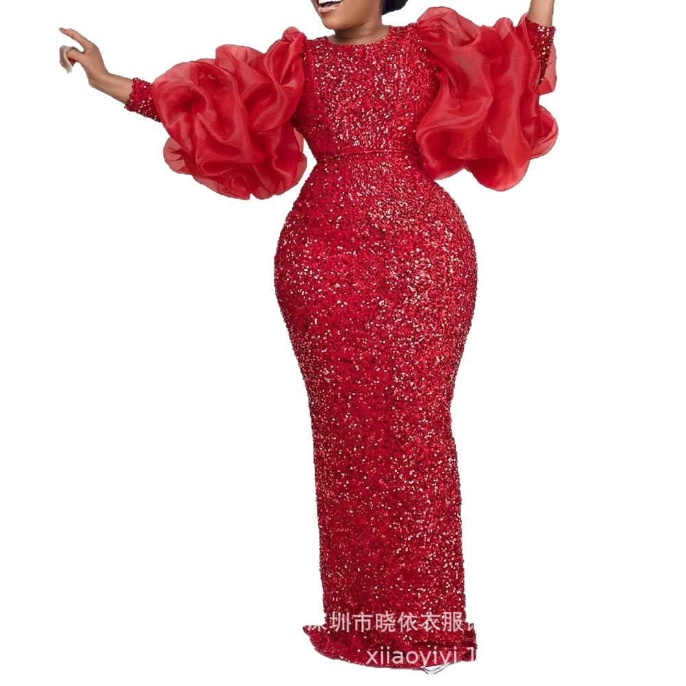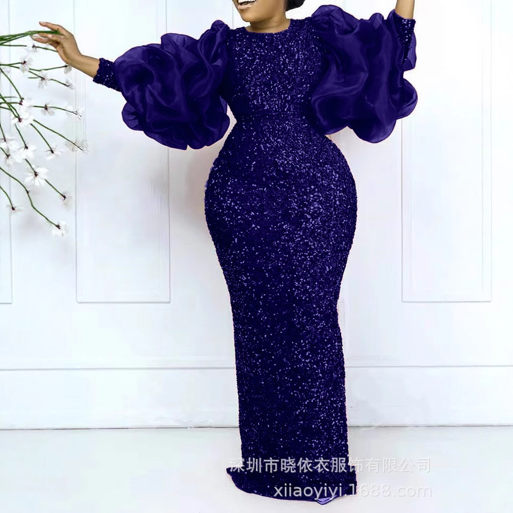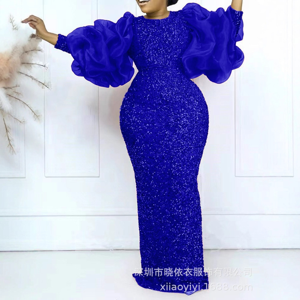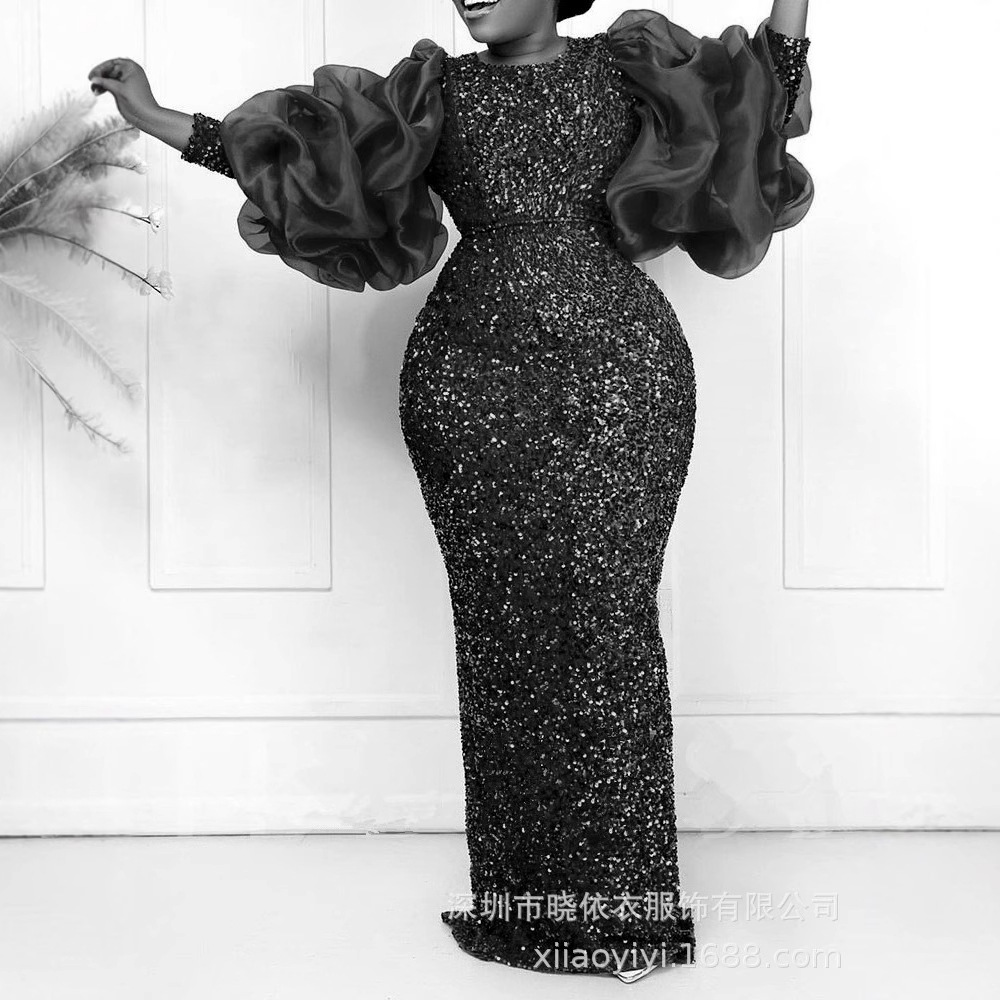 Amazon Cross-Border Trade European and American Plus-Size Puff Sleeve Sequin Embroidery High-Waisted Elegant Women's Dress Evening Gown