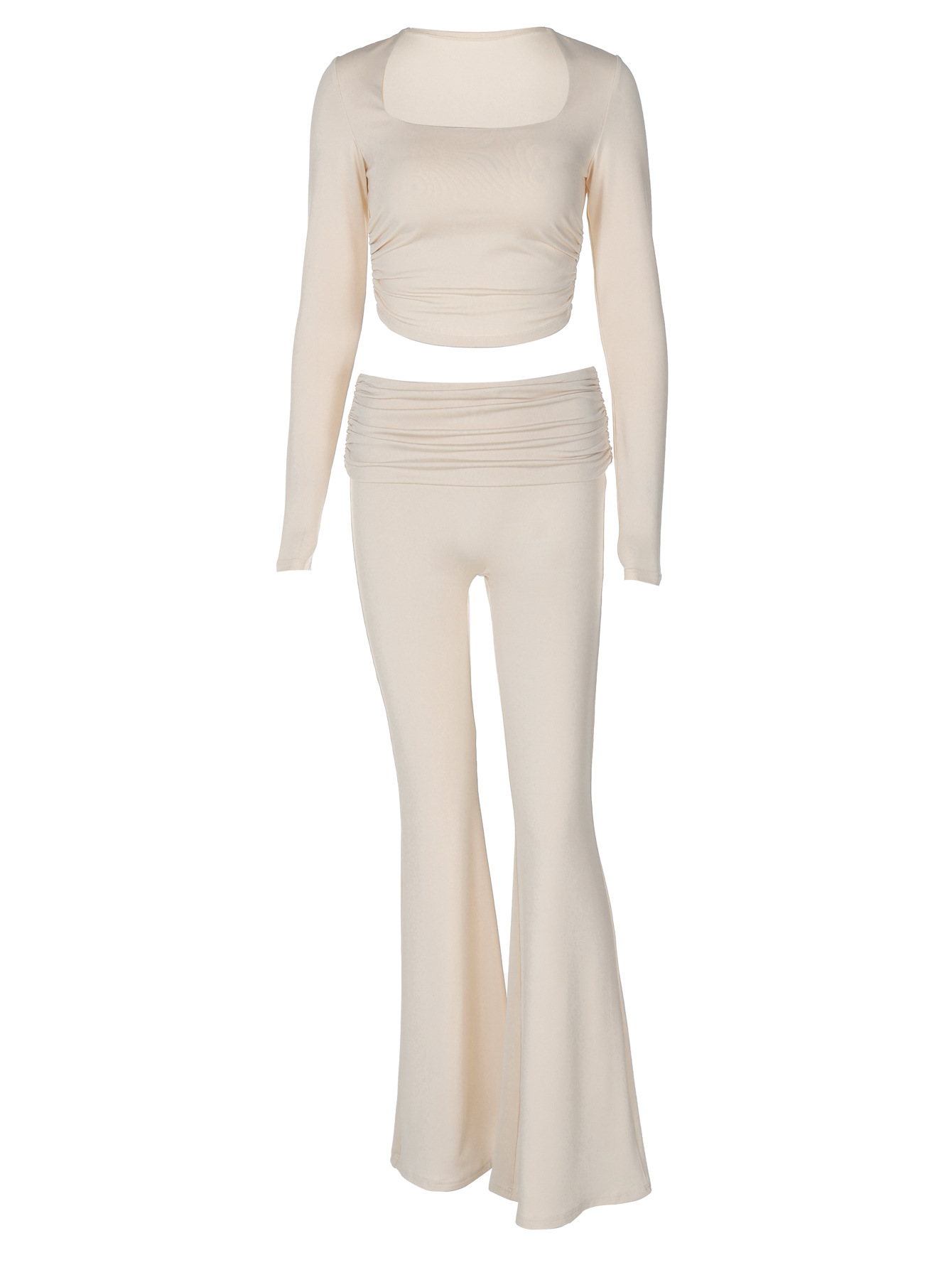 Amazon European and American Women's 2025 Spring New Solid Color Long Sleeve Tight Pants Two-Piece Set Pleated Slim Fit suit