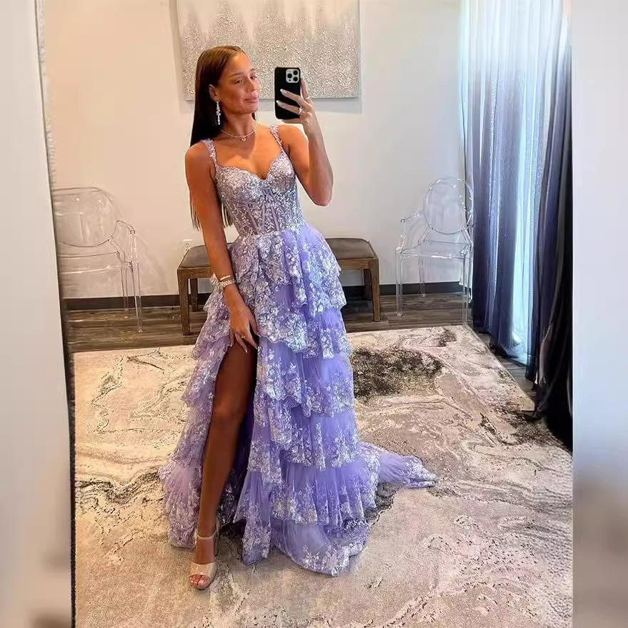 Amazon Long Layered Lace Tulle Prom Sexy Celebrity Dress Thin Shoulder Strap Shiny Formal Party Gown
