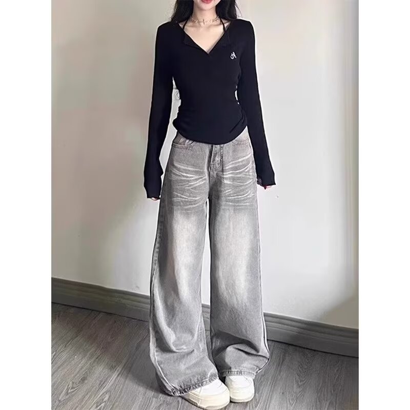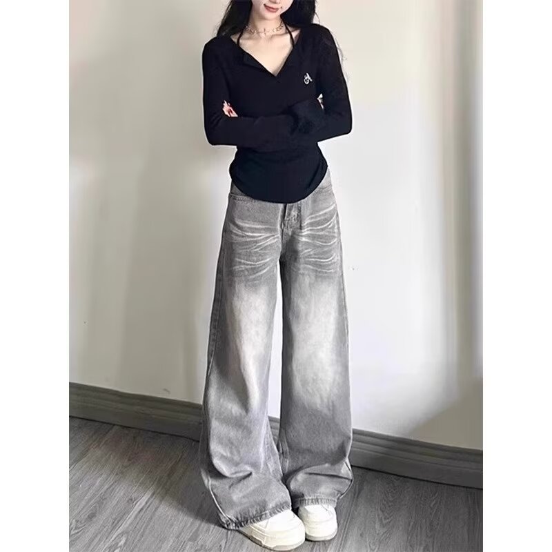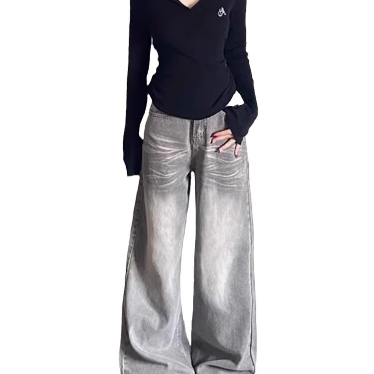 American Style Retro Old Grey Wide Leg Jeans Autumn and Winter New High Waist Loose Slimming Hip Covering Dragging Pants