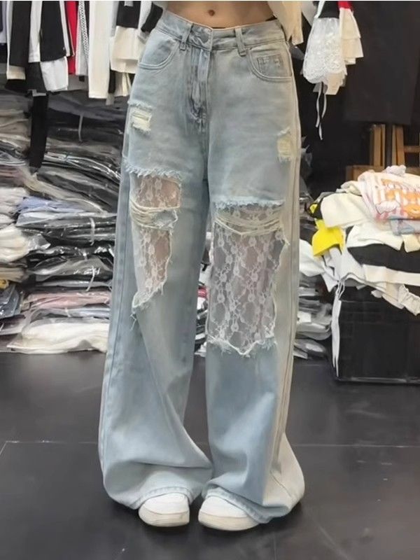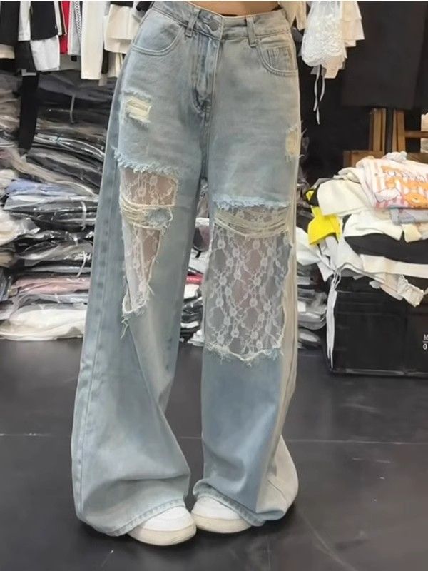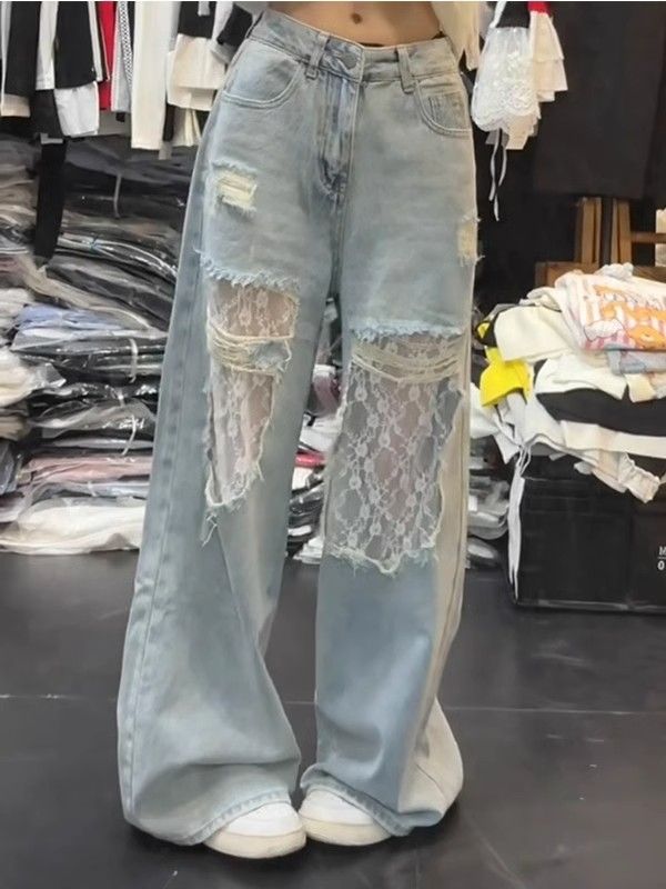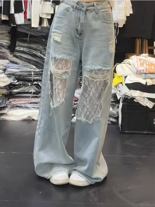 American Style Retro Ripped Lace Stitching Jeans Women's Spring New Lazy Style Casual All-Match Straight Wide-Leg Pants
