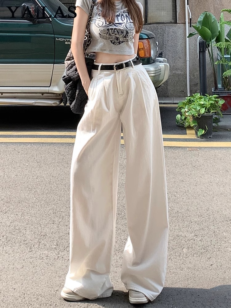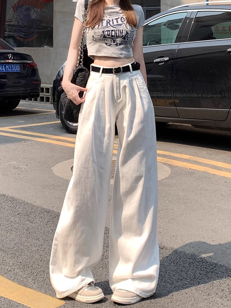 American Style White Wide Leg Jeans Women's Autumn New High Waist Slim-fit Loose Pleated Laid-back Straight Pants