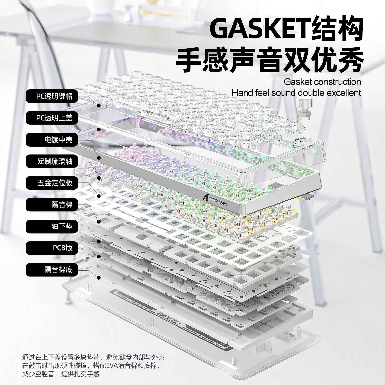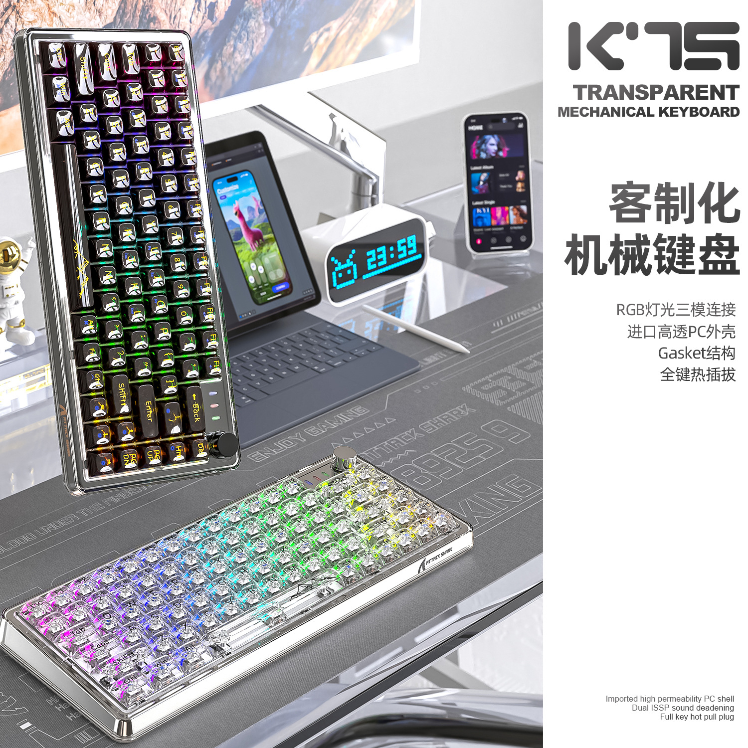 Attack Shark K75Rgb Wireless Mechanical Keyboard Bluetooth Transparent Gasket Hot-Swappable Keyboard