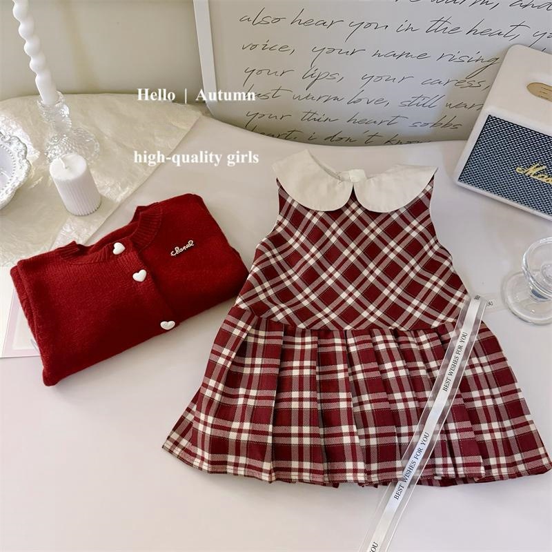 2025 New Autum Baby Girl Red Plaid Skirt Pure Color Knitted Cardigan Sweater Korean Preppy Style Two-Piece Trendy Set