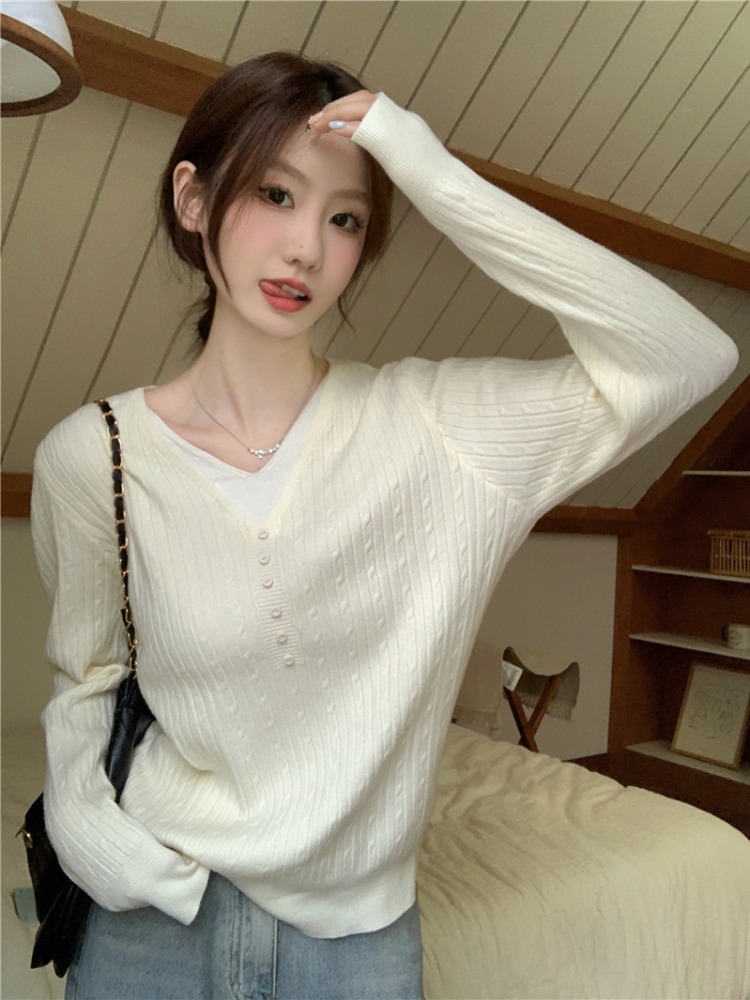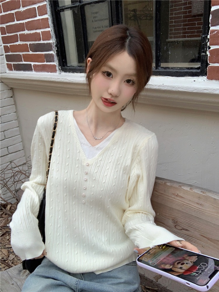 Autumn and Winter 2024 New Fake Two-piece Inner Base Sweater Outer Wear Women's Chanel Style Knitwear apricot Top