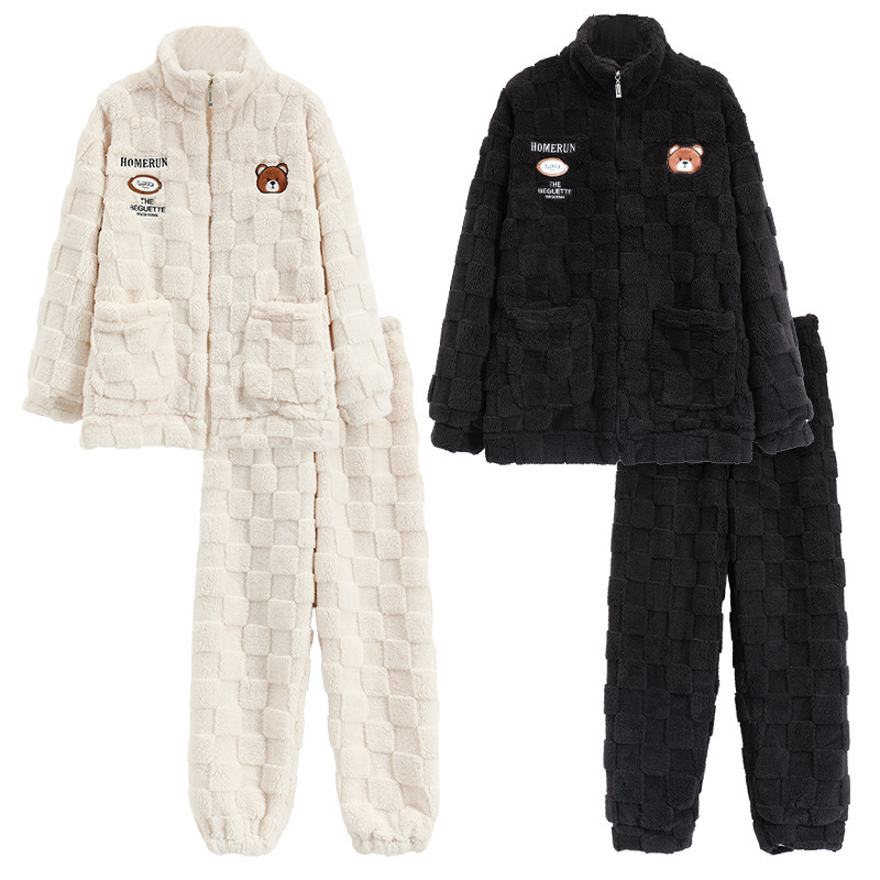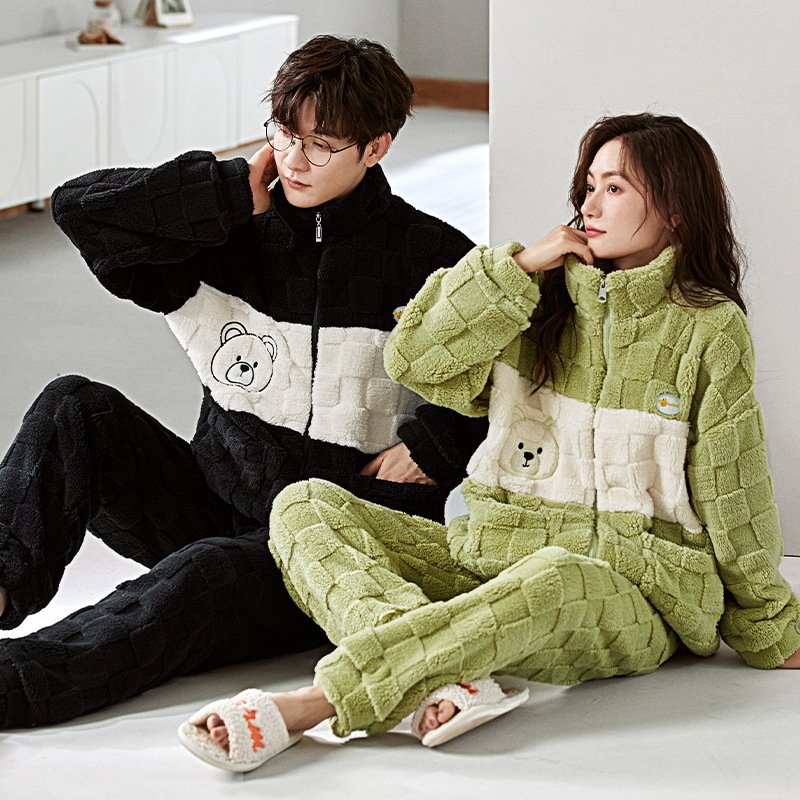 Autumn and Winter Bear Couple Pajamas Women Warm Velvet Zipper Cardigan Flannel Men's fleece-lined Thickened Coral Velvet