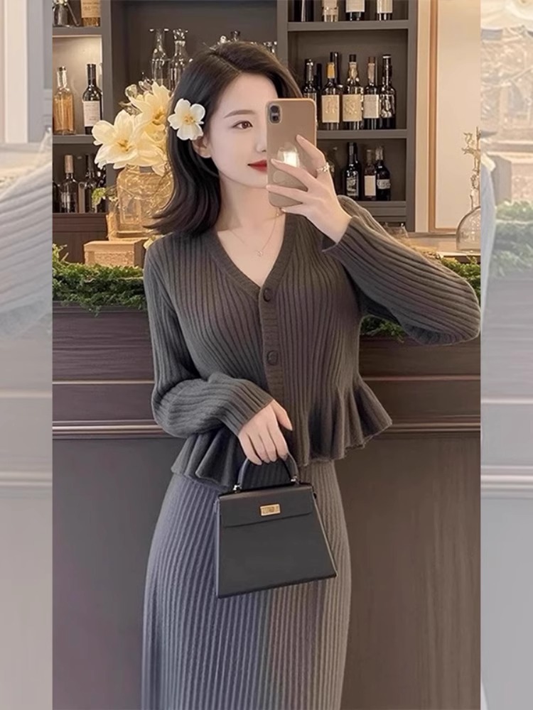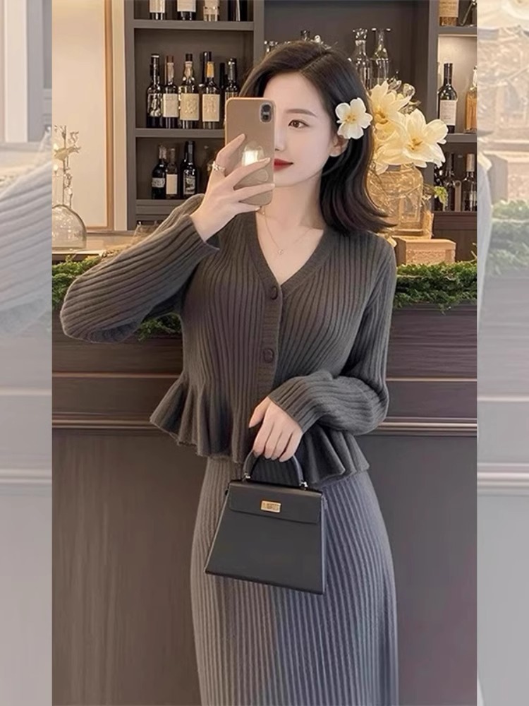 Autumn and winter high-grade gray set of Korean style early winter wear suit women's fashion sweater skirt two-piece set