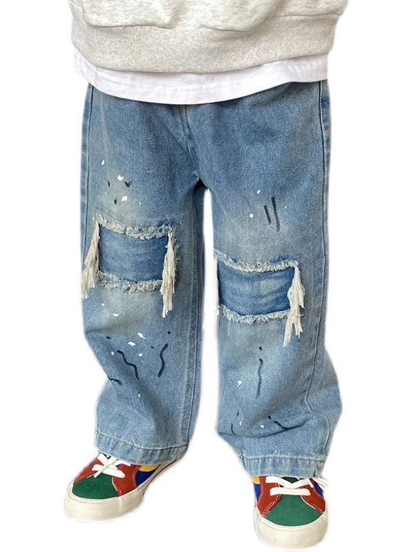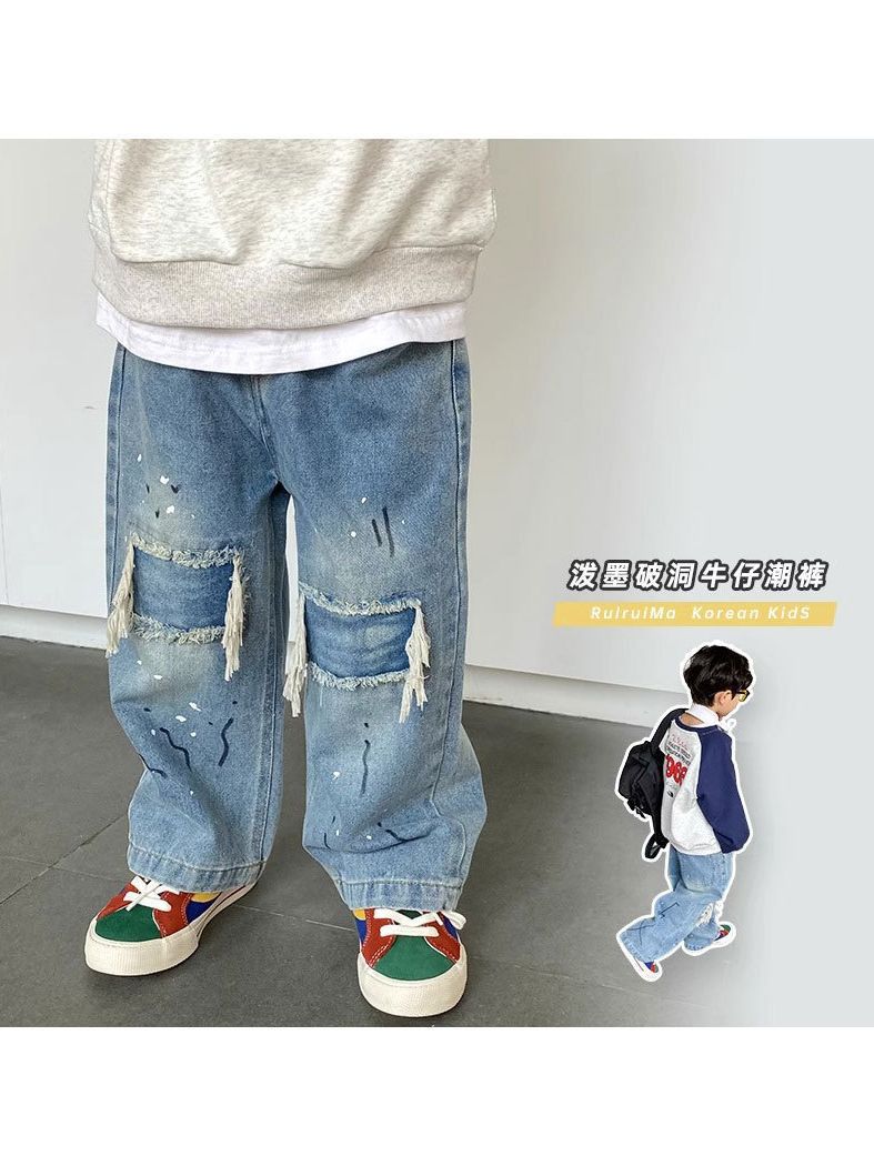 Autumn Korean style ripped paint splash-ink wide-leg pants personality handsome medium and large baby boy children's jeans pants fashion pants