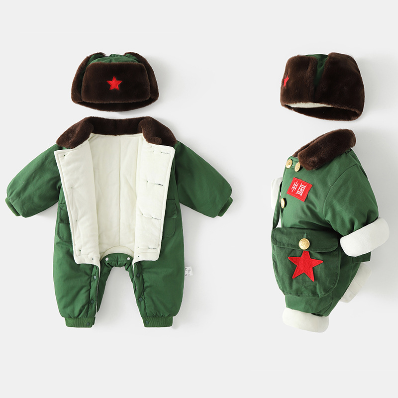 Baby Clothes Winter Clothes fleece-lined Warm Military Uniform Full Moon Baby Red Army One-piece Cotton Coat One-year-old Army Coat Climbing Clothes