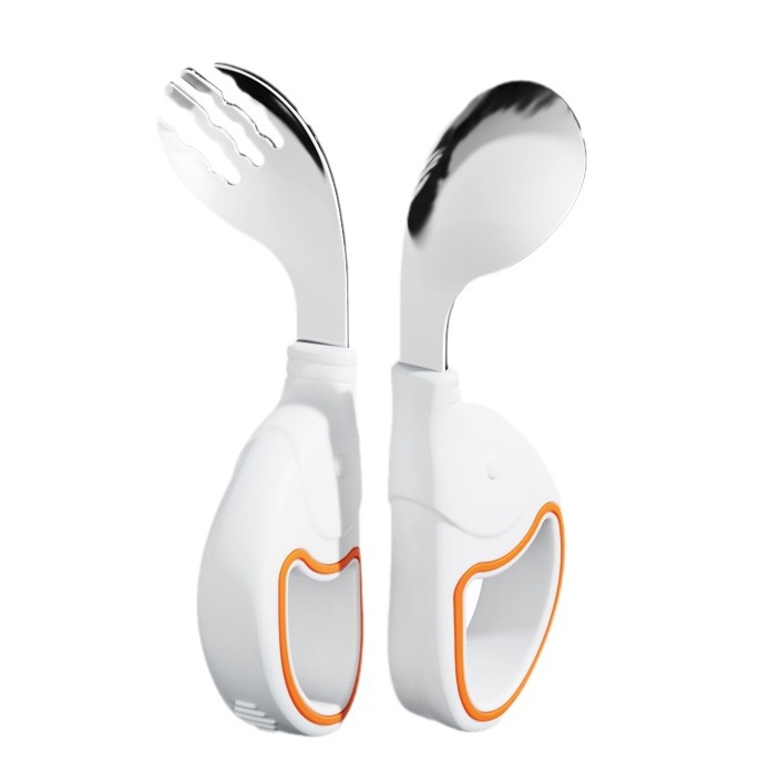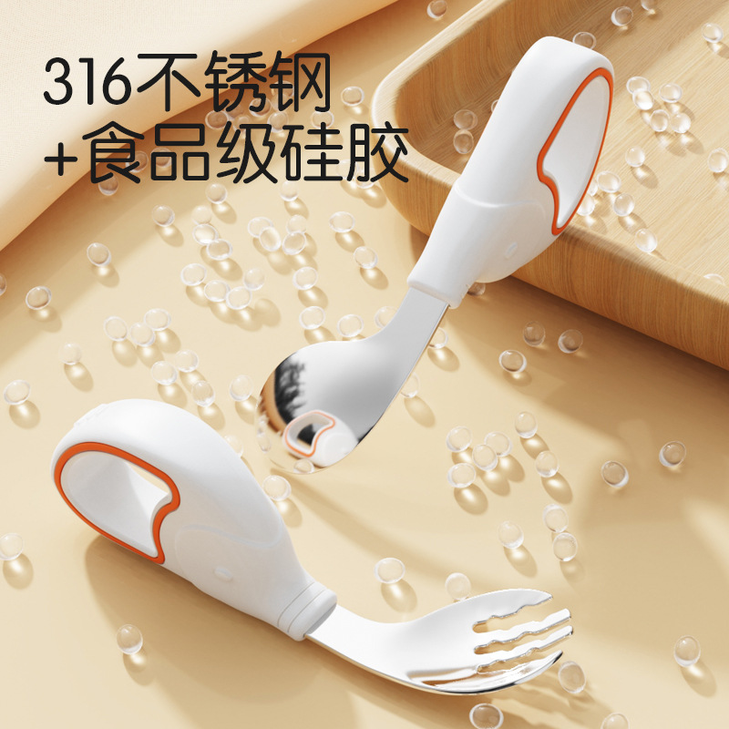 Baby Spoon Stainless Steel Ring Fork Spoon suit Training Supplementary Spoon Children's Tableware Short Handle Learning Silicone Spoon