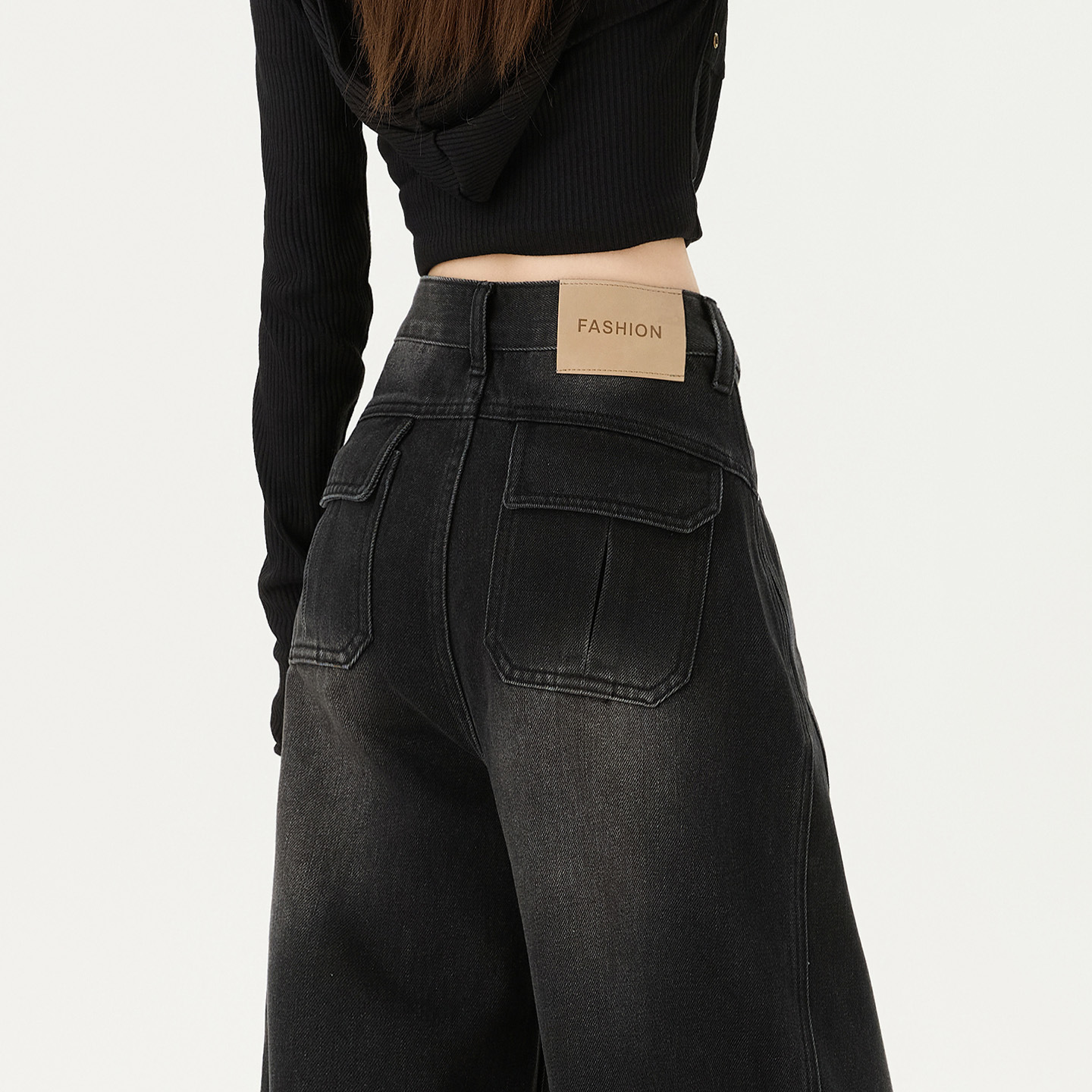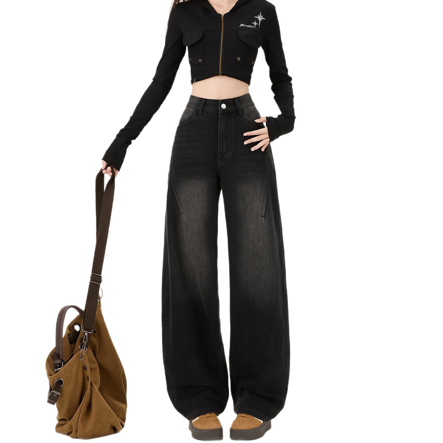 Black and Gray Scimitar Wide-Leg Jeans for Women 2025 Autumn and Winter Fleece-Lined Warm Loose High-Waist Draped Versatile Floor-Length Pants