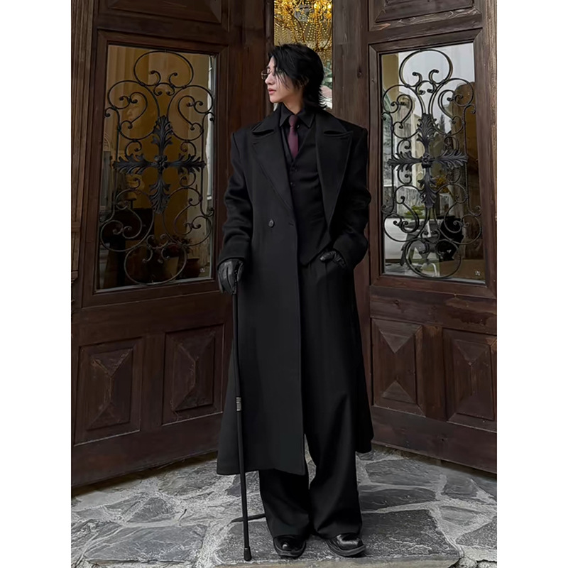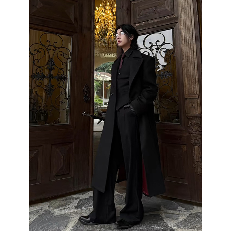 Black Red Inner Godfather Windbreaker Jacket Men's Autumn and Winter Mid-Length Woolen Suit British Style Shoulder Pad Woolen Coat