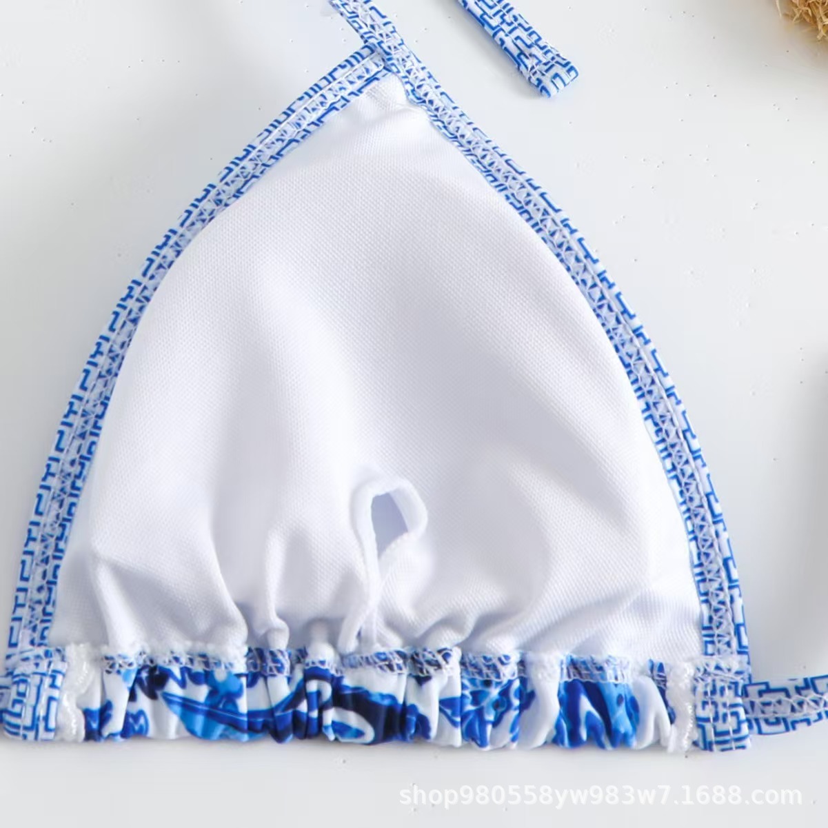 Blue and White Porcelain New Foreign Trade Three-point Split Bikini Women's Swimsuit Sexy Backless Neck Lace-up Swimsuit Biki