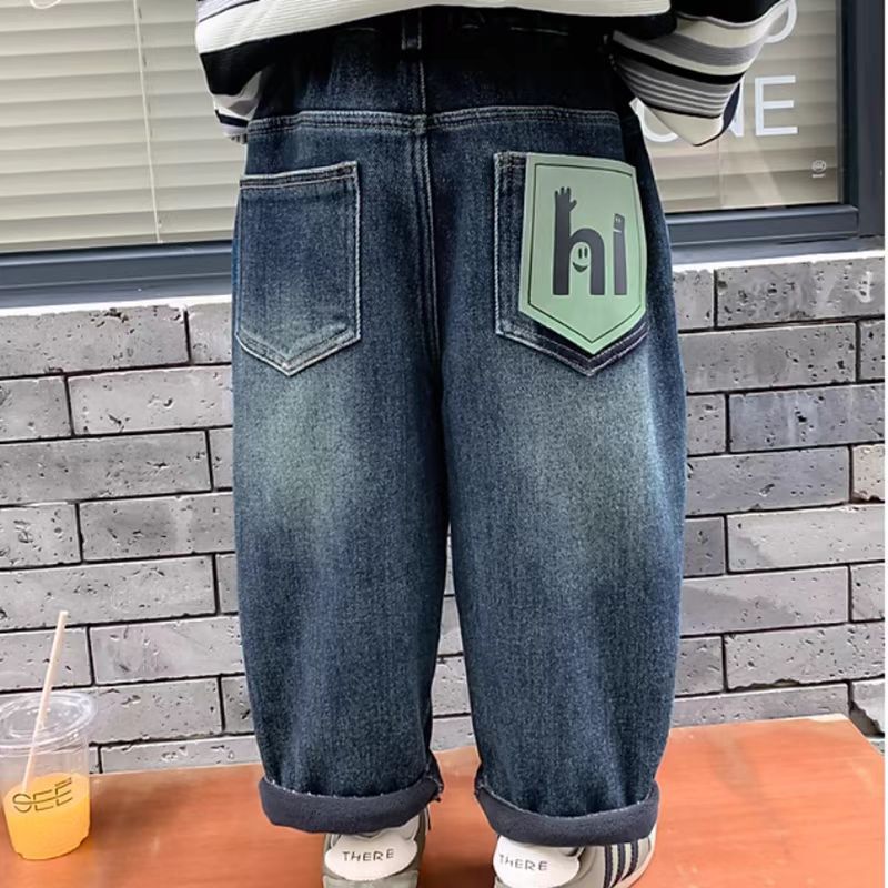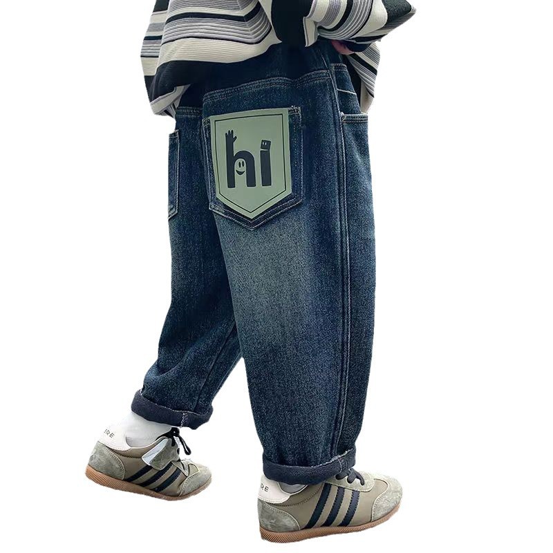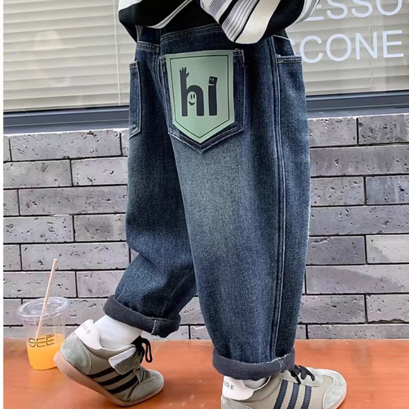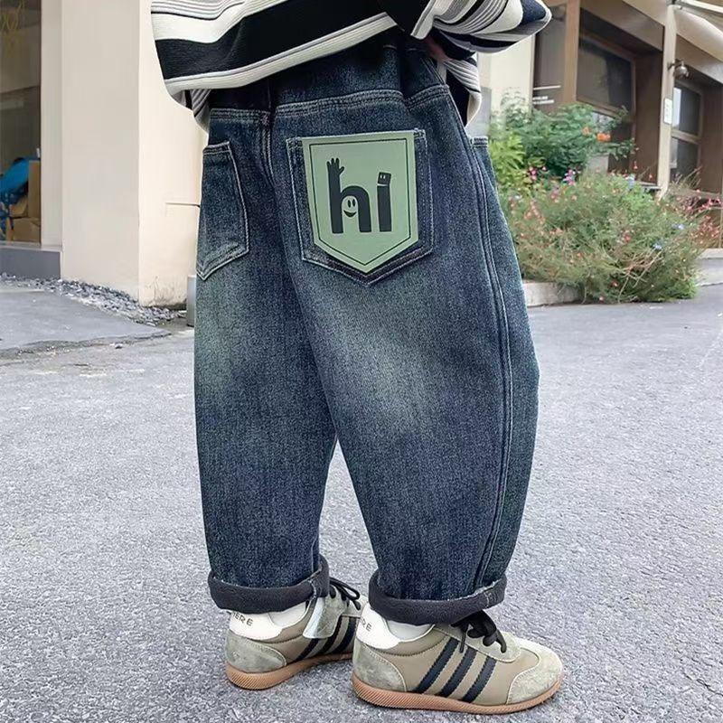 Boys Jeans New Children's Simple Autumn and Winter One-piece Velvet Denim Casual Pants Men's Treasure Dad Pants 2024 fleece-lined