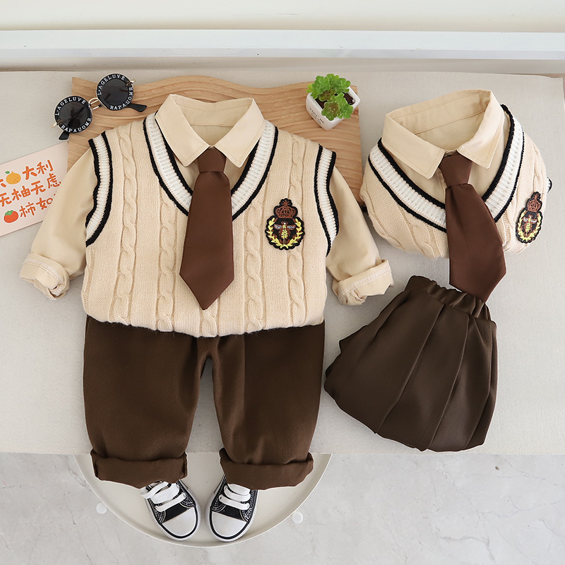 Boys' Spring Clothing New Style Western Style suit Girl Baby's Spring and Autumn Sweater Vest Pleated Skirt Three-Piece Suit