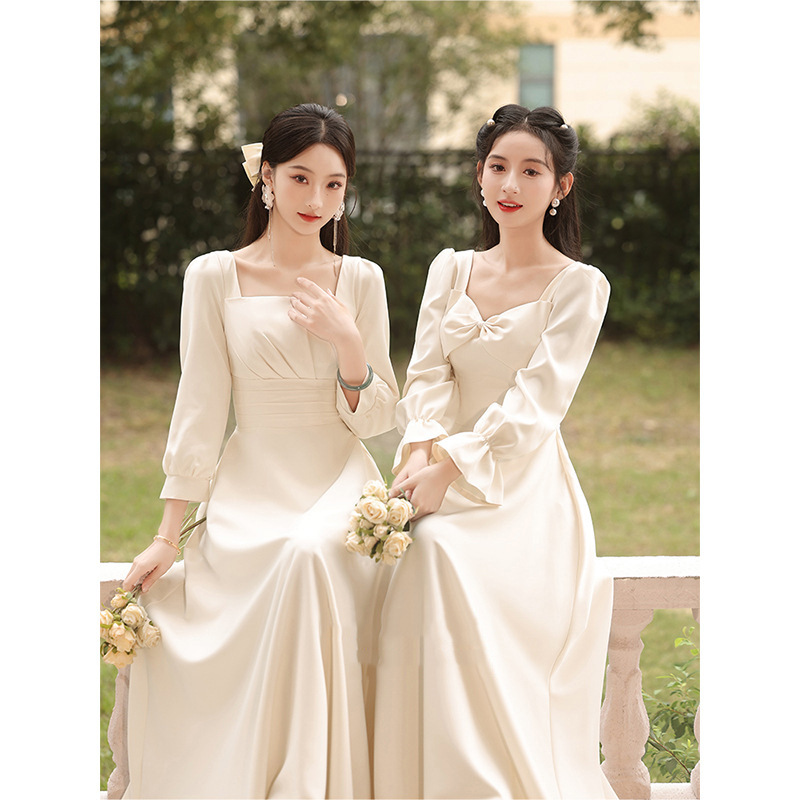 Bridesmaid Dress 2025 New Elegant Long-Sleeved Sister Dress Champagne Color Can Be Worn at Ordinary Times Niche High-End Evening Dress for Women