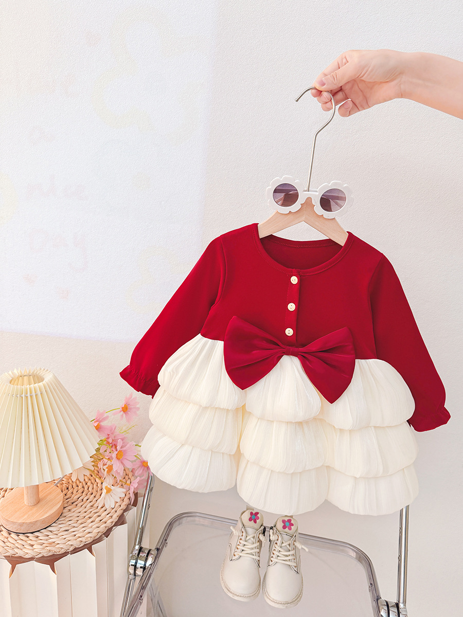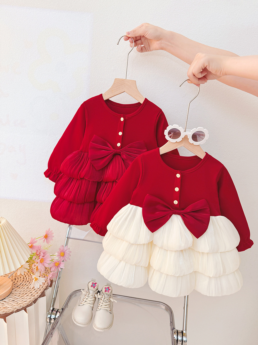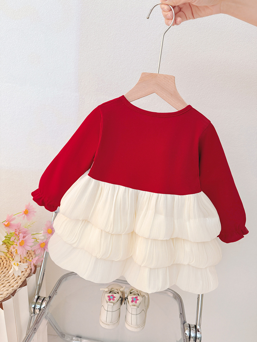 Children's New Autum Princess Dress Baby Girl Long-Sleeved Red Christmas Dress Round Neck New Year's Dress