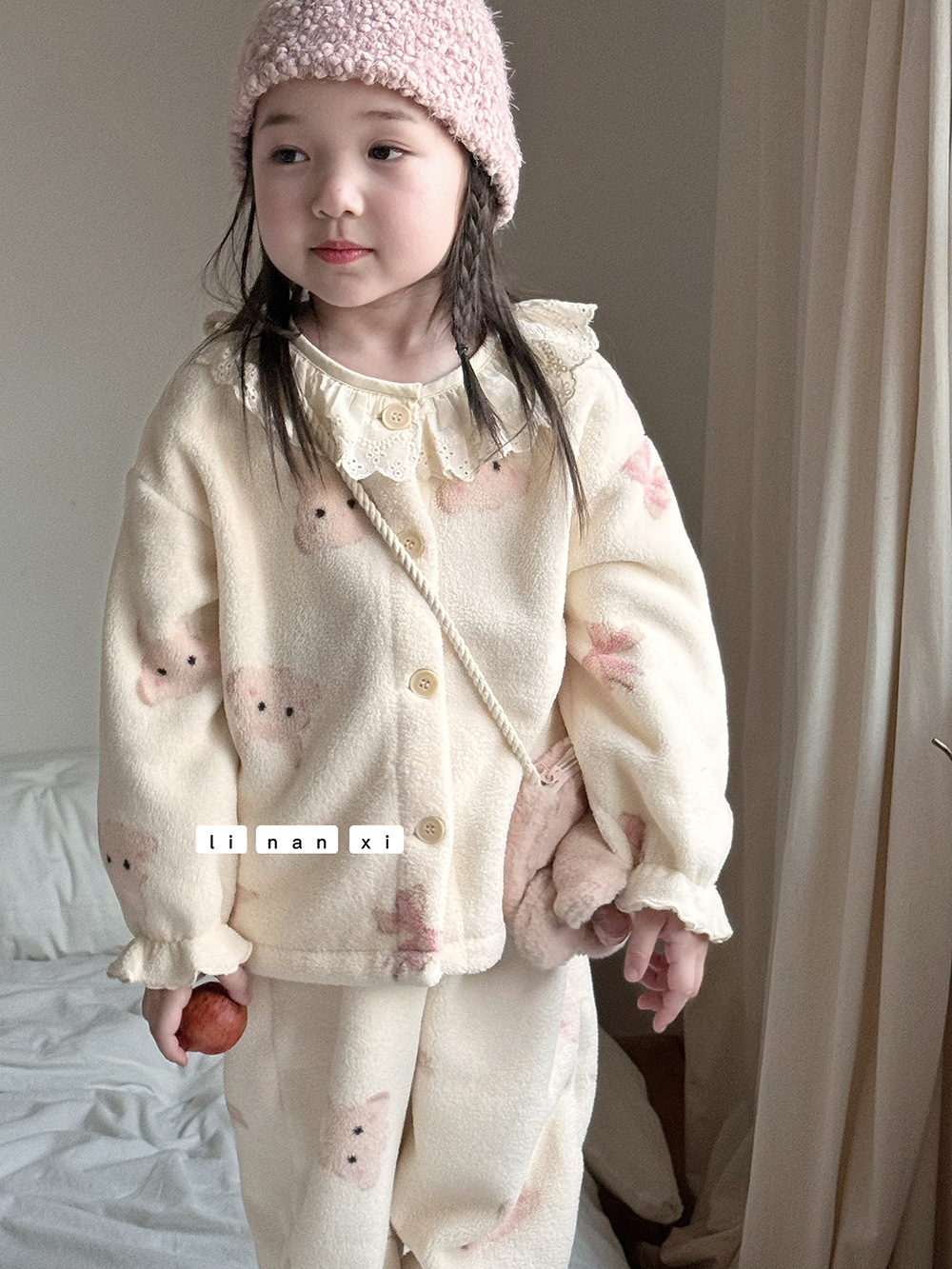 Children's Pajamas Autumn and Winter 2025 New Fleece-Lined Thickened Girls' Baby Homewear Set Korean Style Lace Cardigan