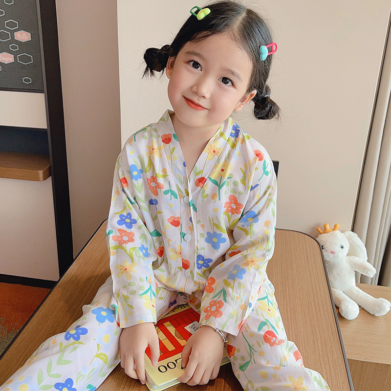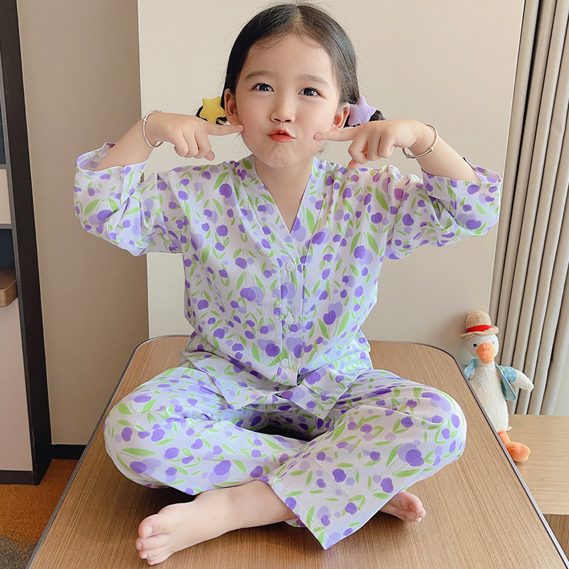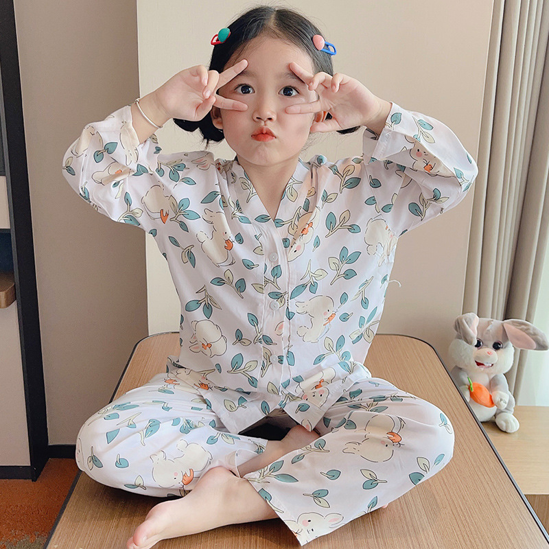 Baby's Cotton Silk Pajamas Men's and Women's Baby Children's Home Clothes Air Conditioning Thin Children's Artificial Cotton Silk Suit Long Sleeve Cardigan for Summer