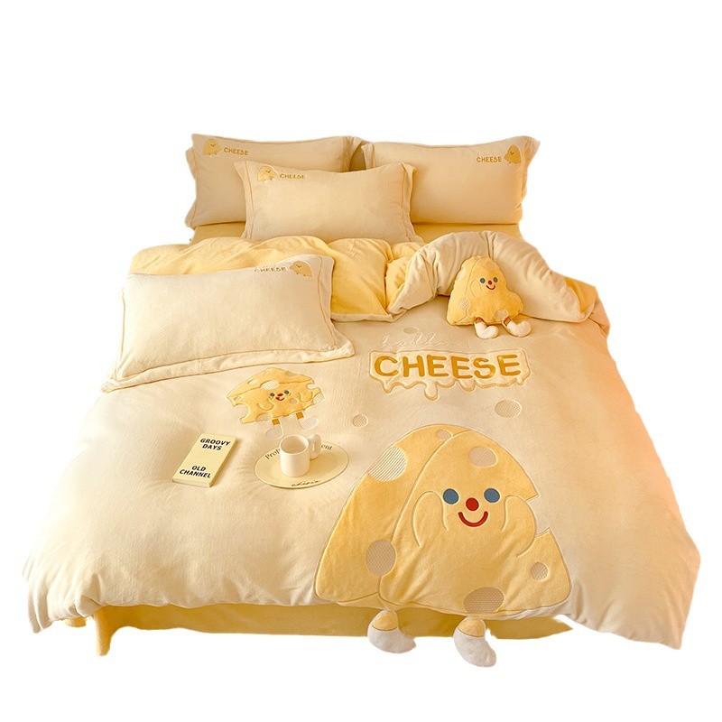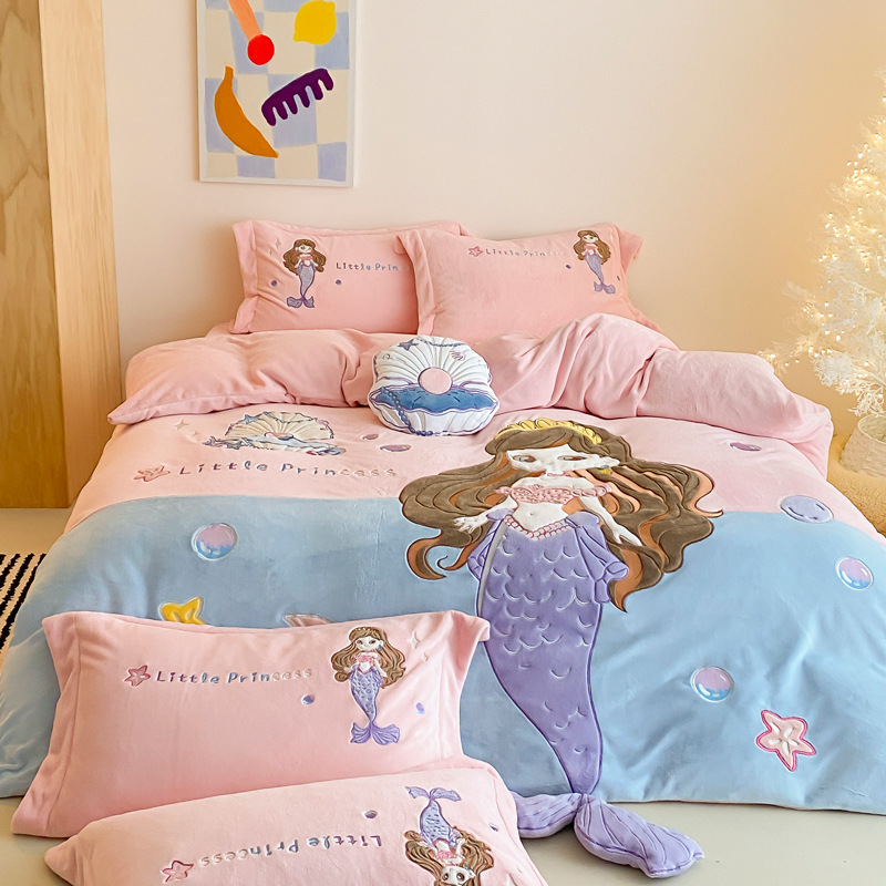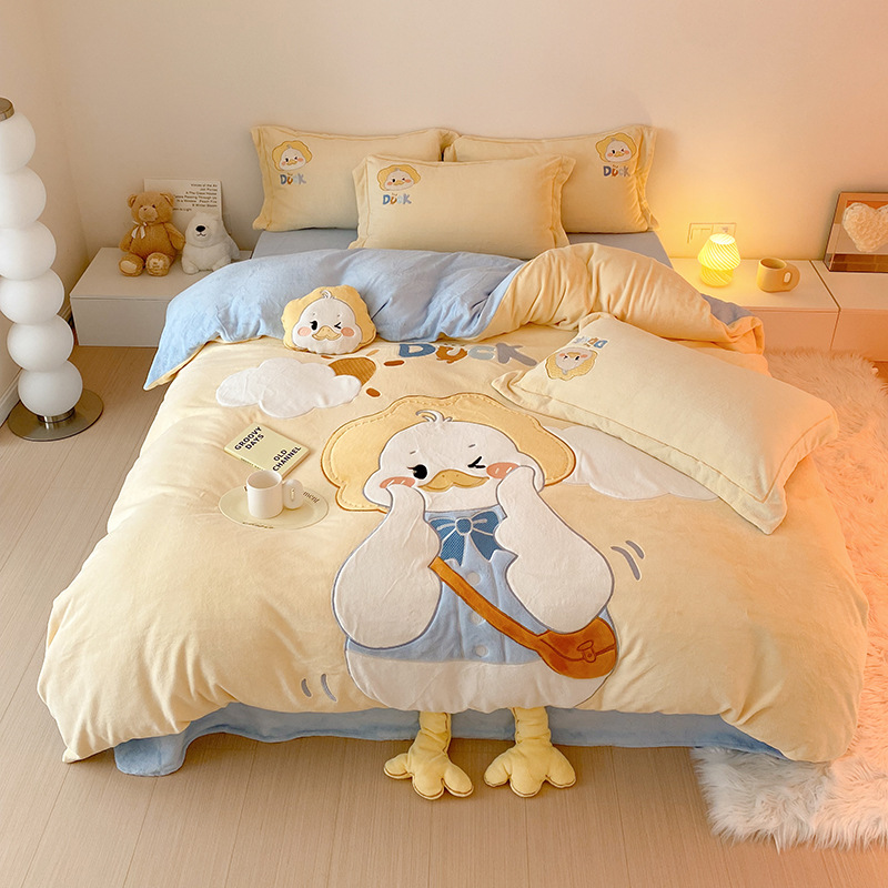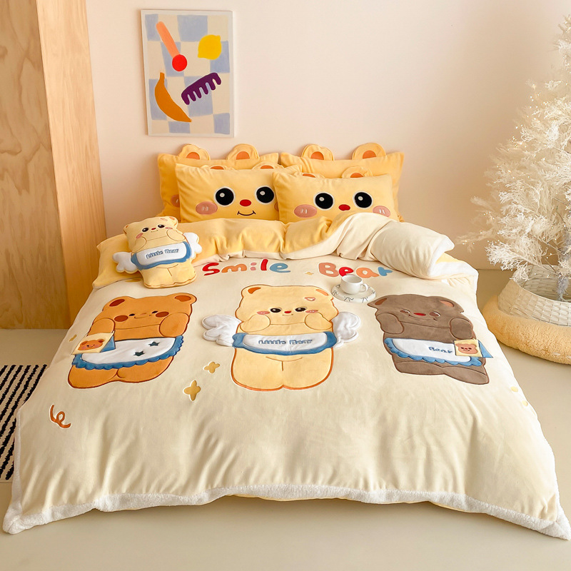 Class A milk velvet four-piece set winter coral velvet children's cartoon bed hat warm bed sheets bedding three-piece set