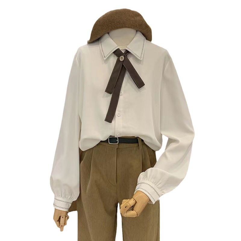 College Style Bow Tie Brushed Shirt for Women, New Autumn and Winter Fashionable Long-Sleeved Top Shirt