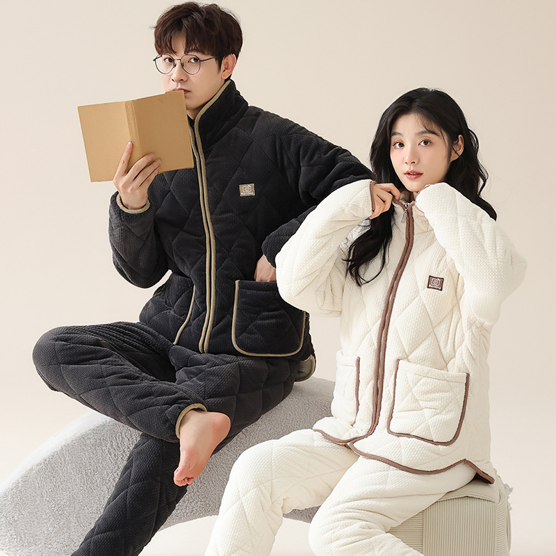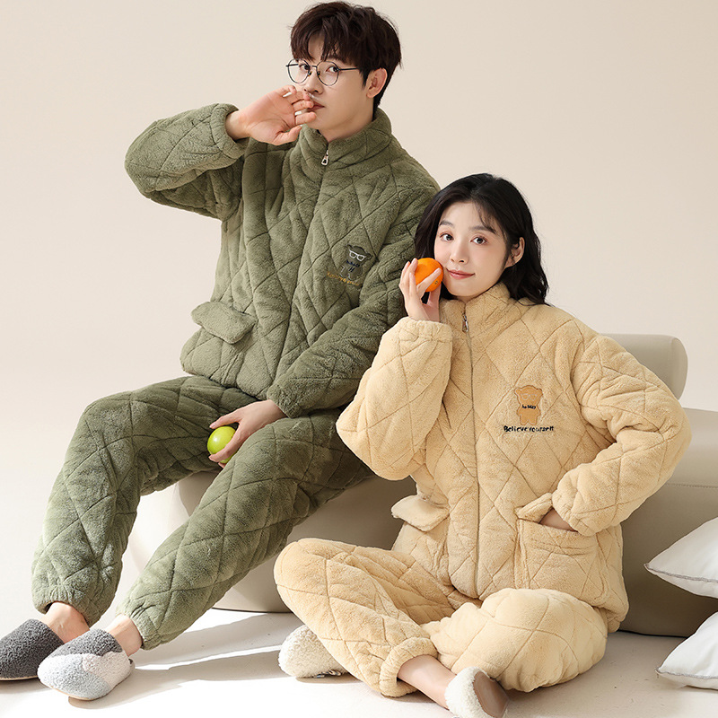 Couple pajamas women's autumn and winter three-layer quilted coral fleece thickened fleece-lined winter warm flannel home wear Men