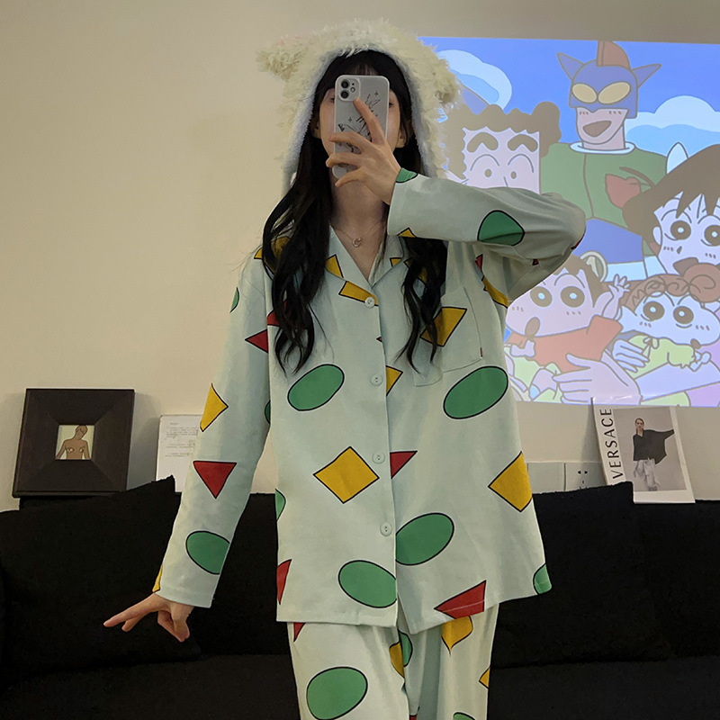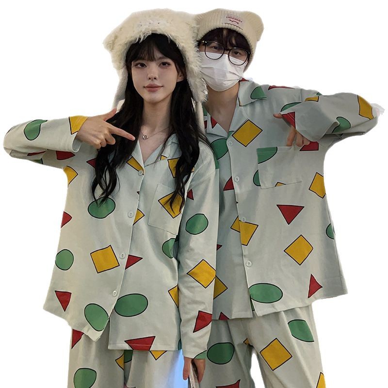 Couple's Pajamas Men's and Women's Spring and Autumn Long Sleeve Geometric Japanese Style Xiaoxin Same Style Home Clothes Two-piece Suit