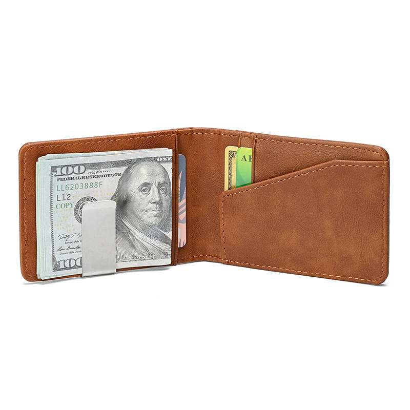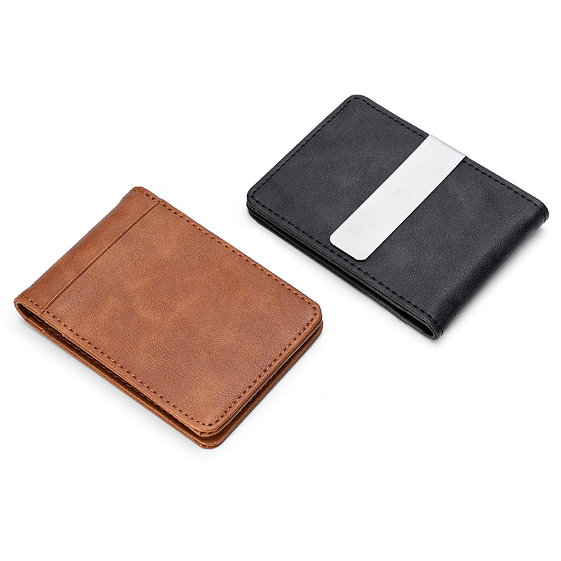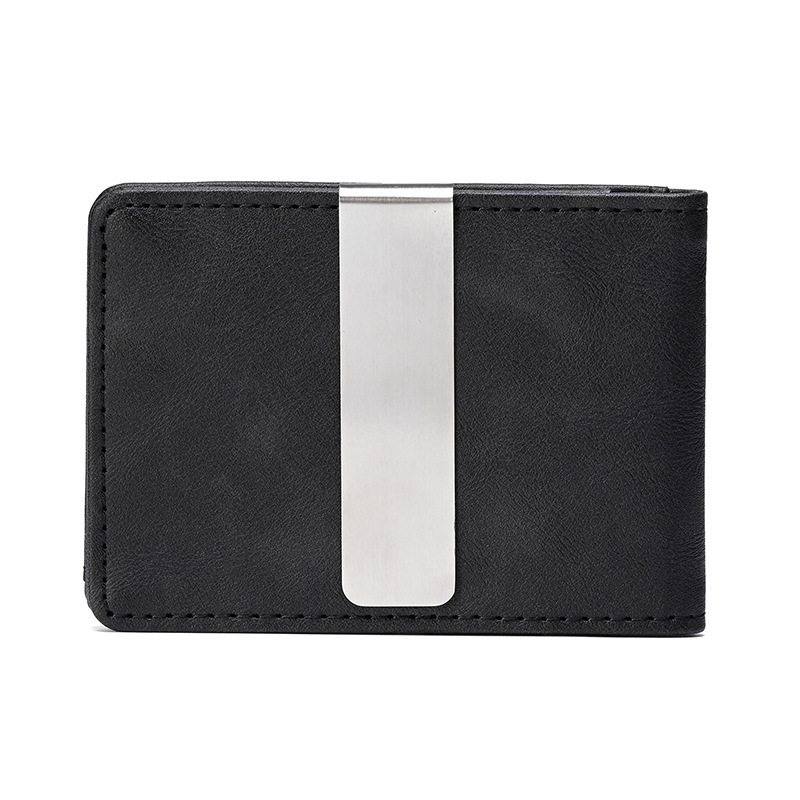 Cross-Border Card Holder Id Holder Men's Crazy Horse Pattern Short Wallet Stainless Steel Dollar Wallet Credit Card Holder Pu