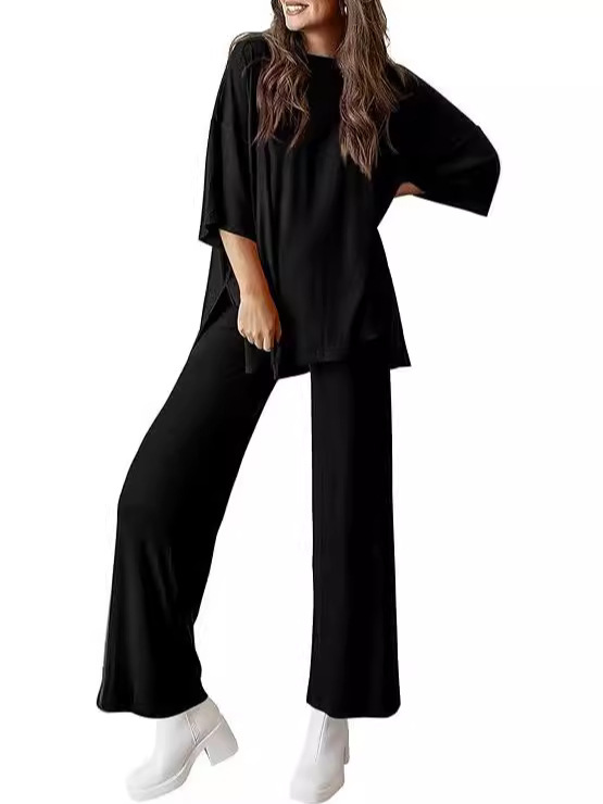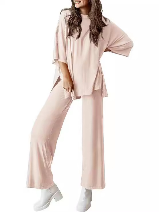 Cross-border Foreign Trade Amazon temu202 Women's Fashion Casual Round Neck Loose T Side Pocket Pajamas suit