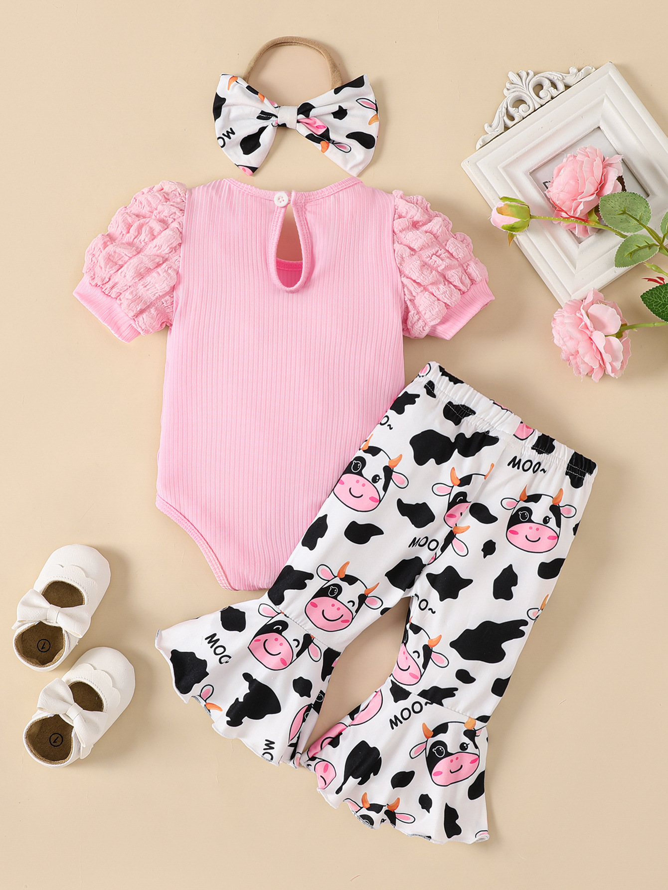 Cross-Border Ins Newborn Baby Girl Summer Style Puff Sleeve Romper with Bell-Bottom Pants and Hair Accessory Set