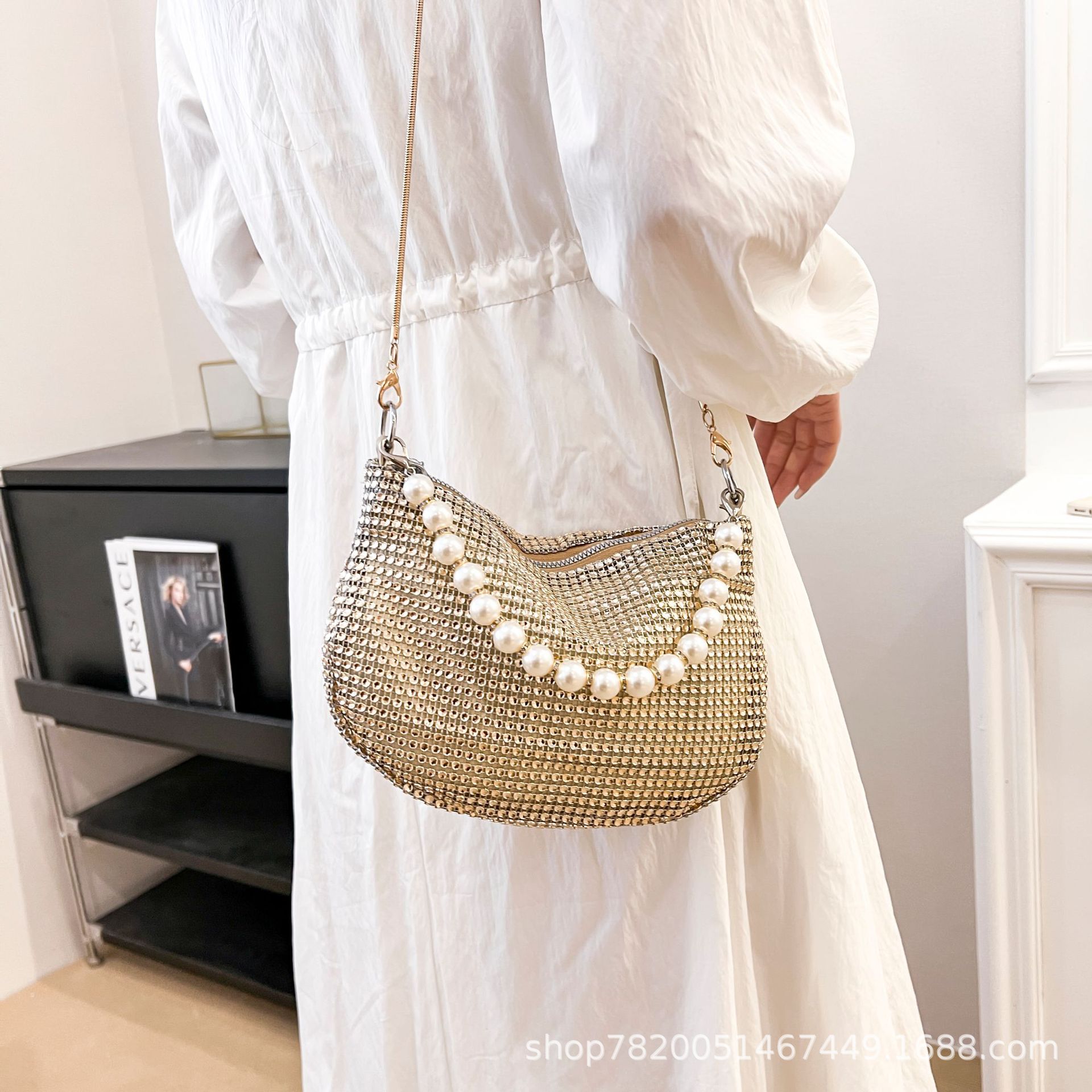 Cross-Border Pearl Bag Women's Handbag Fashion Imitation Full Diamond Bag Handbag Shoulder Bag Party Dinner Bag Shoulder Bag Batch