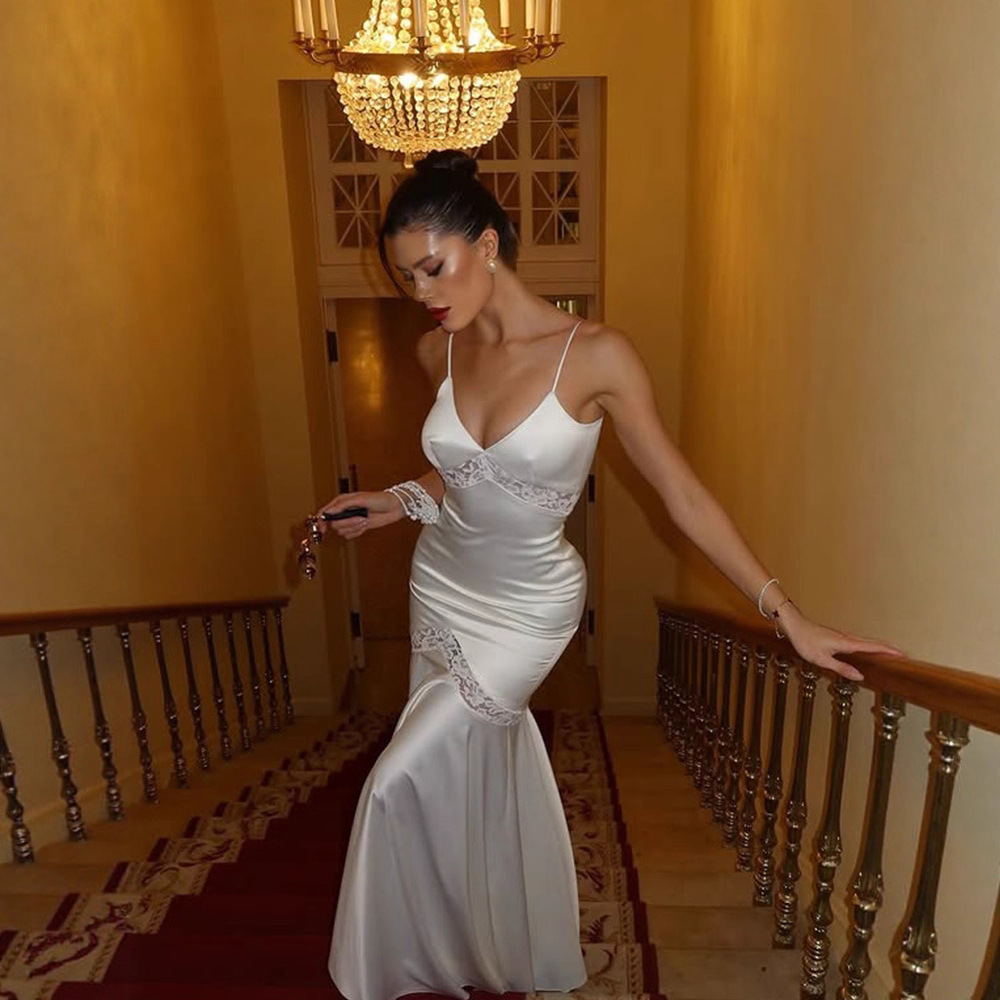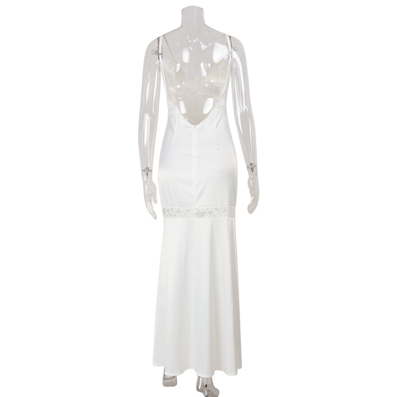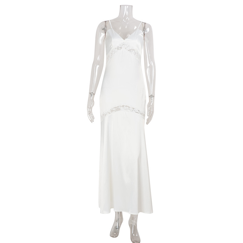 Cross-Border Women's Solid Color Simple French Elegant Slim V-Neck Strap Long Dress Lace Splicing Evening Dress