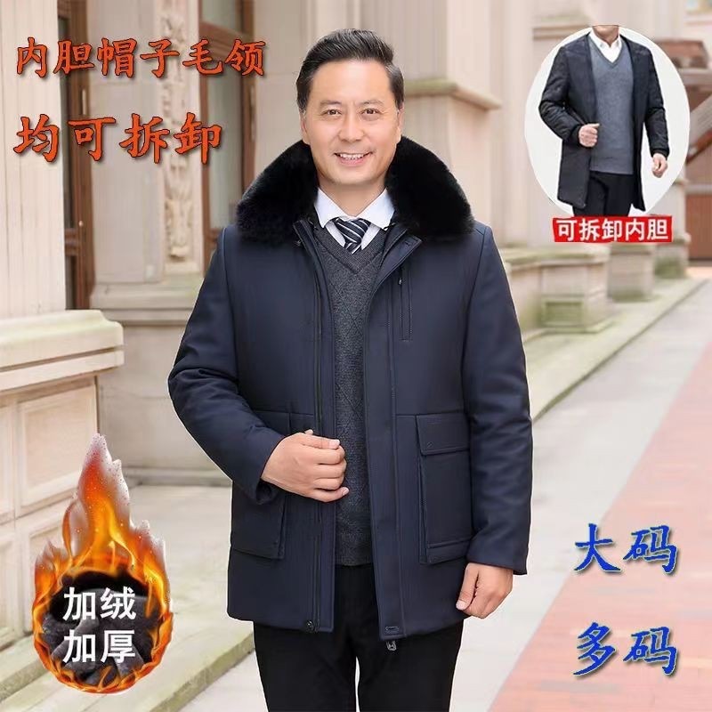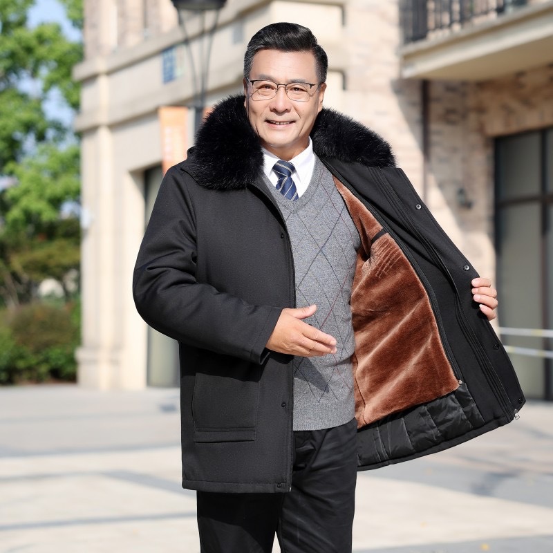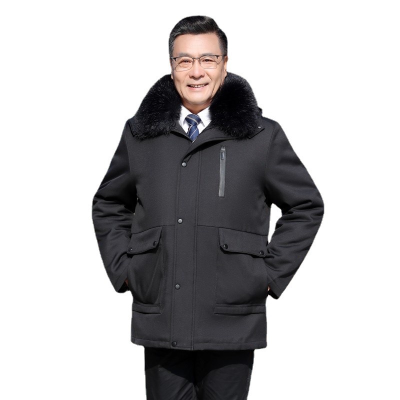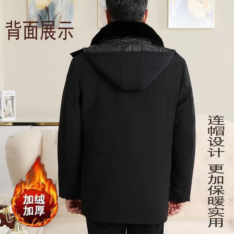 Dad's Winter Clothing, Middle-Aged and Elderly Men's Fleece-Lined Cotton Jacket, Thickened Cold-Proof Fur Collar Hooded Casual Parka Jacket