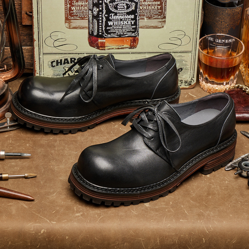 Derby Casual Leather Shoes for Men, Thick-Soled Fashionable Japanese Style Work Shoes, Versatile Genuine Leather British Style Lace-Up Low-Top E334