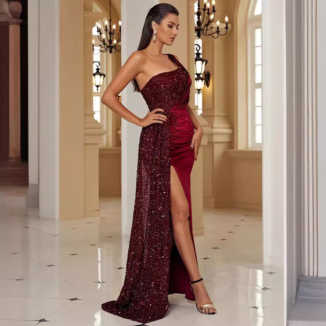 European and American Export Women's Accessible Luxury Classy Fishtail Classy Banquet Elegant Host Single Off-Shoulder Dress Evening Dress for Women