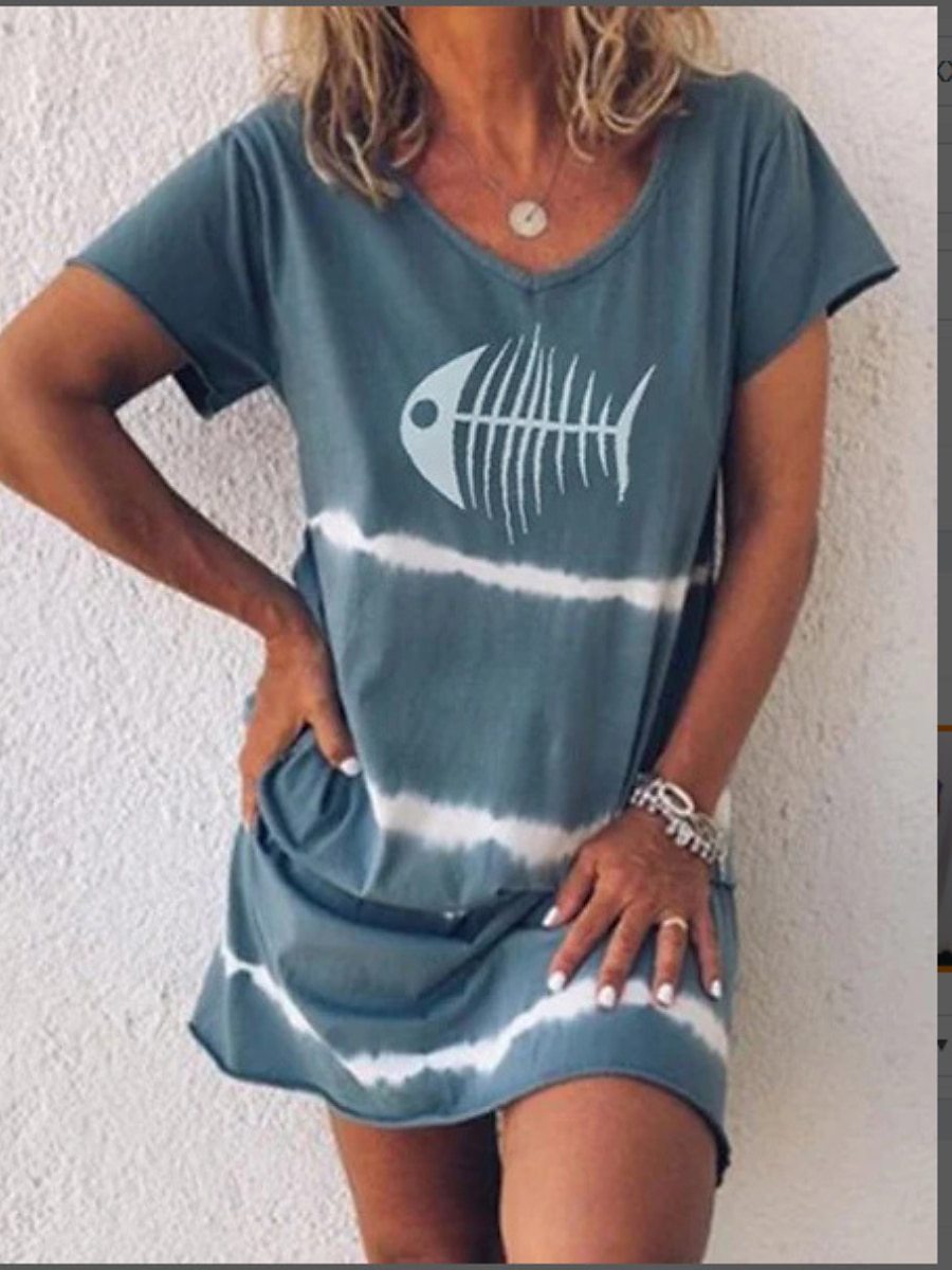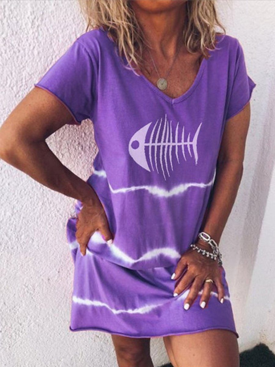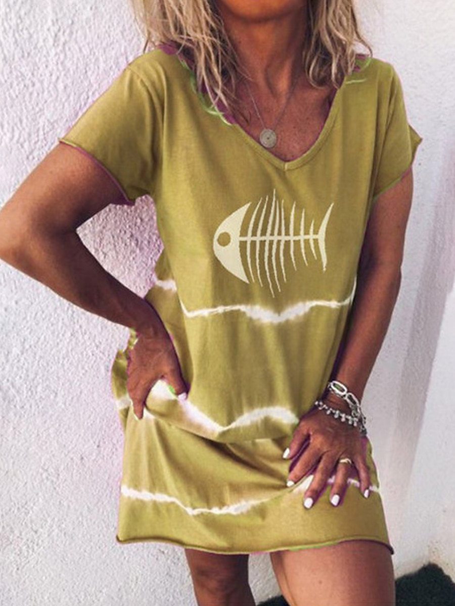 European and American women T-shirt clothing fish bone print V your dress family daily wear casual comfortable female