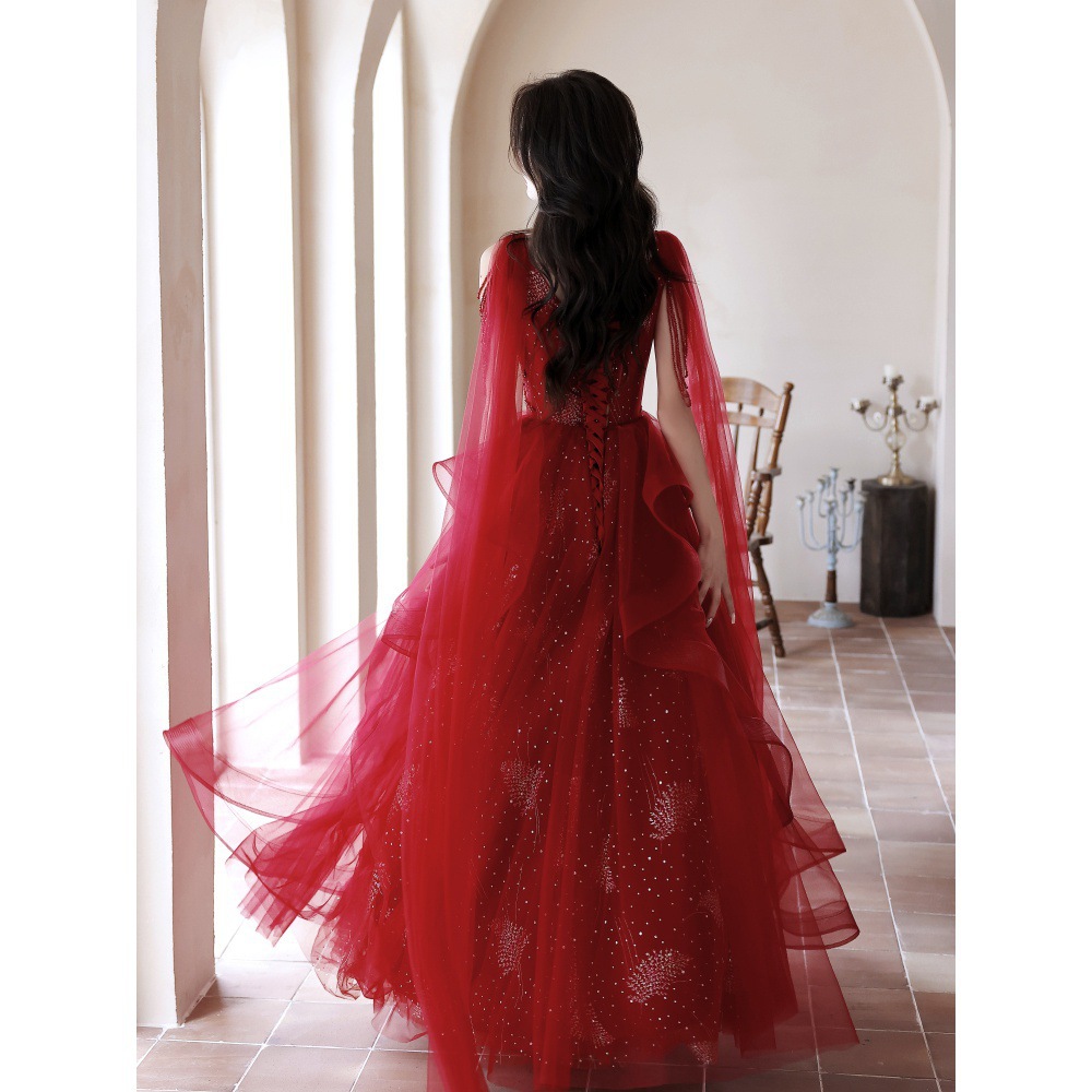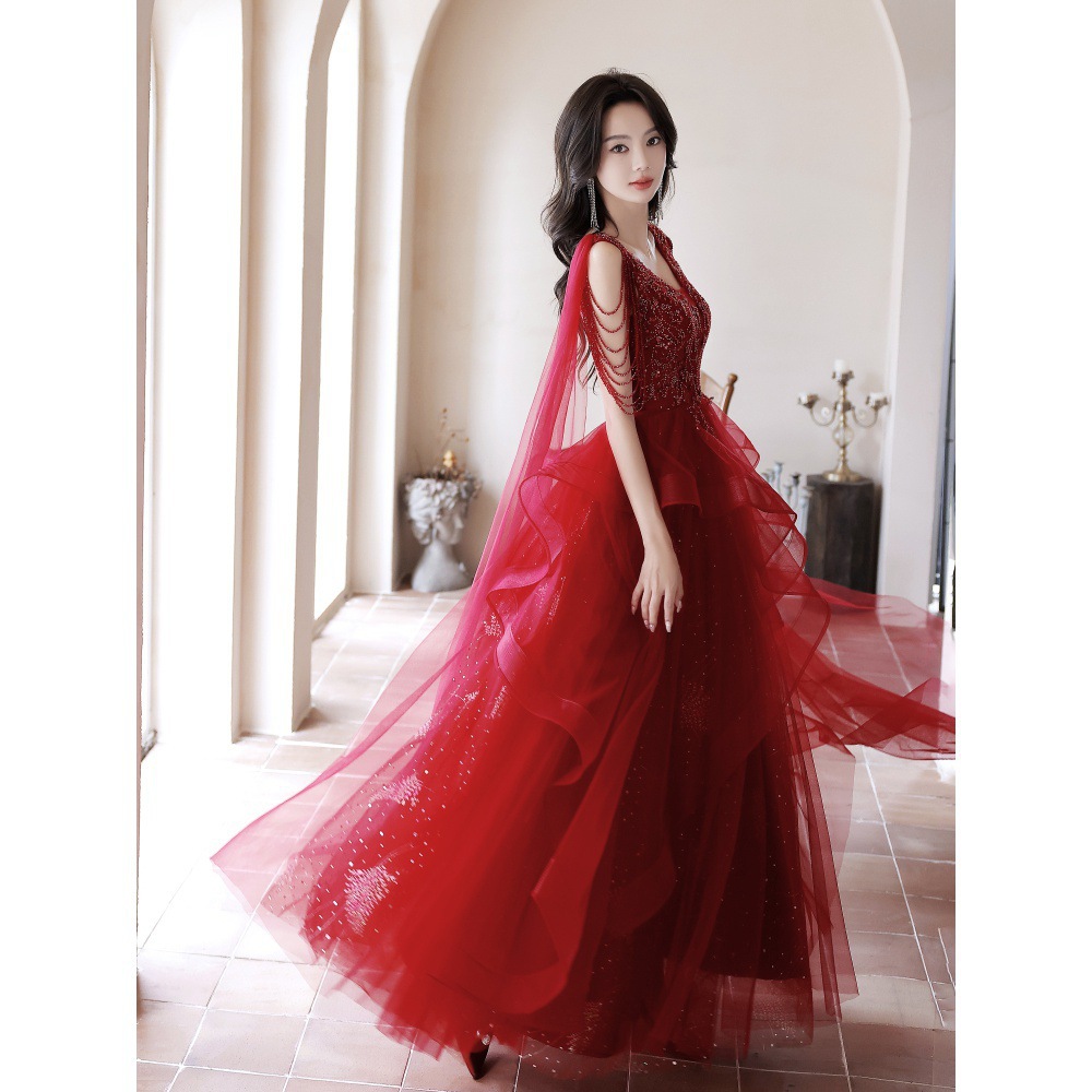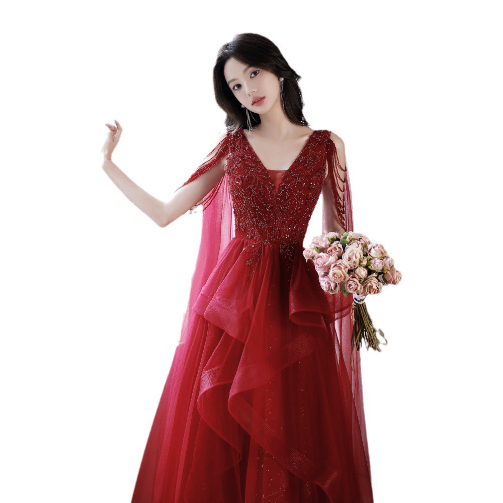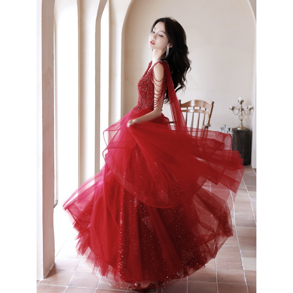Evening Dress Female High-End Red Super Fairy Gauze Summer Host V Neck Toast Dress Bride High-End Main Wedding Dress